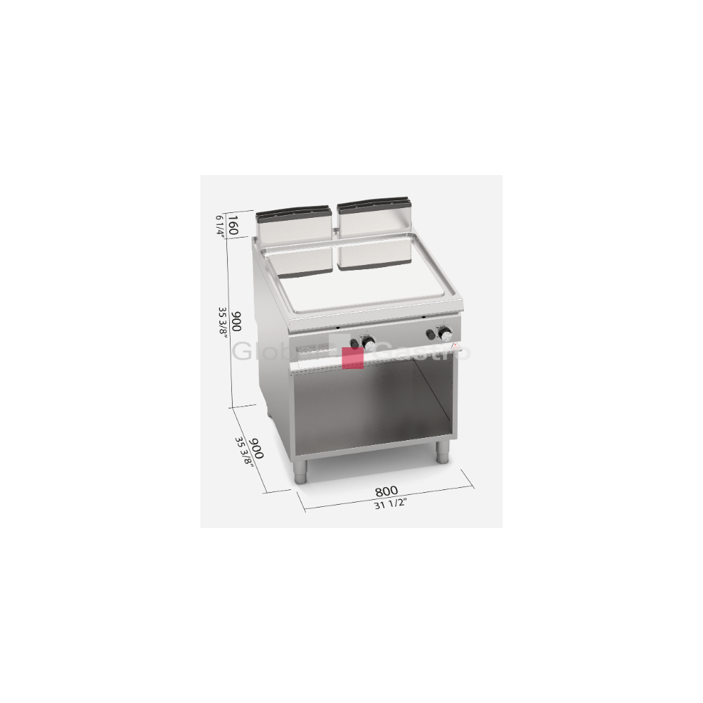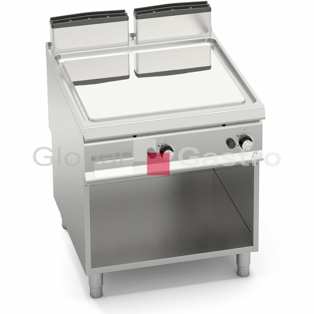 Termostatický ventil 30 až 300°C pro přesnou a bezpečnou regulaci. Termočlánek a chráněný zápalný plamínek. Dvě zóny s nezávislým ovládáním a přesnou regulací teploty. Dvojvrstvá grilovací plotna složená z ocelového plátu a horní vrstvy z nerez oceli AISI 316 s leštěným povrchem, který umožňuje snadné čištění. Nízká úroveň odlesku zvyšuje komfort při práci. Zvýšené postranní lemy. Kompaktní provedení s otevřeným podstavcem. Zvýšený odtah 120 mm není součástí ! Kompletní sortiment plynových a elektrických ploten s různým provedením grilovací plochy. Lze na nich připravovat pokrmy tzv. "kontaktem" a to nejcitlivějším způsobem. Jednotný systém distribuce tepla zaručuje rovnoměrné grilování po celé pracovní ploše, velké energetické úspory a zlepšení pracovního prostředí. Při grilování se přirozeně tvoří zbytkový olej, který je odváděn a shromažďován ve velké odpadní nádobce. Teflonová zátka, odolná vůči vysokým teplotám není součástí smažící plotny.