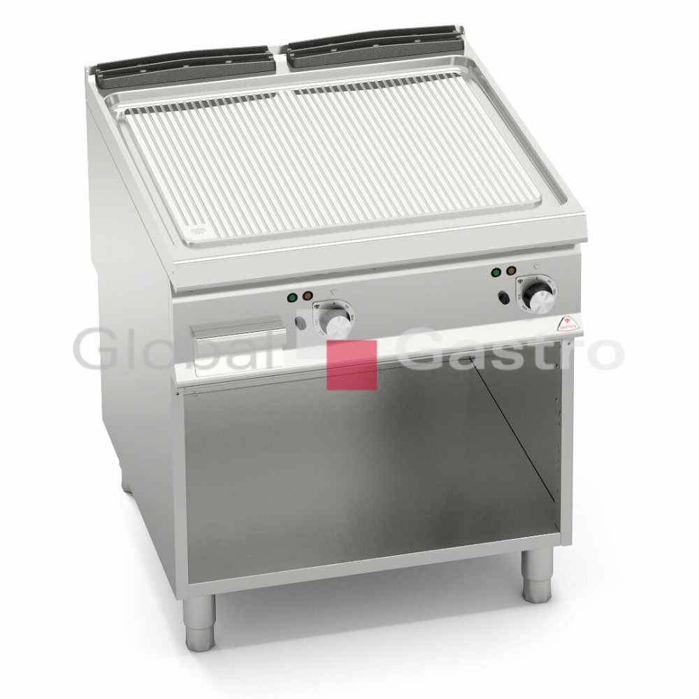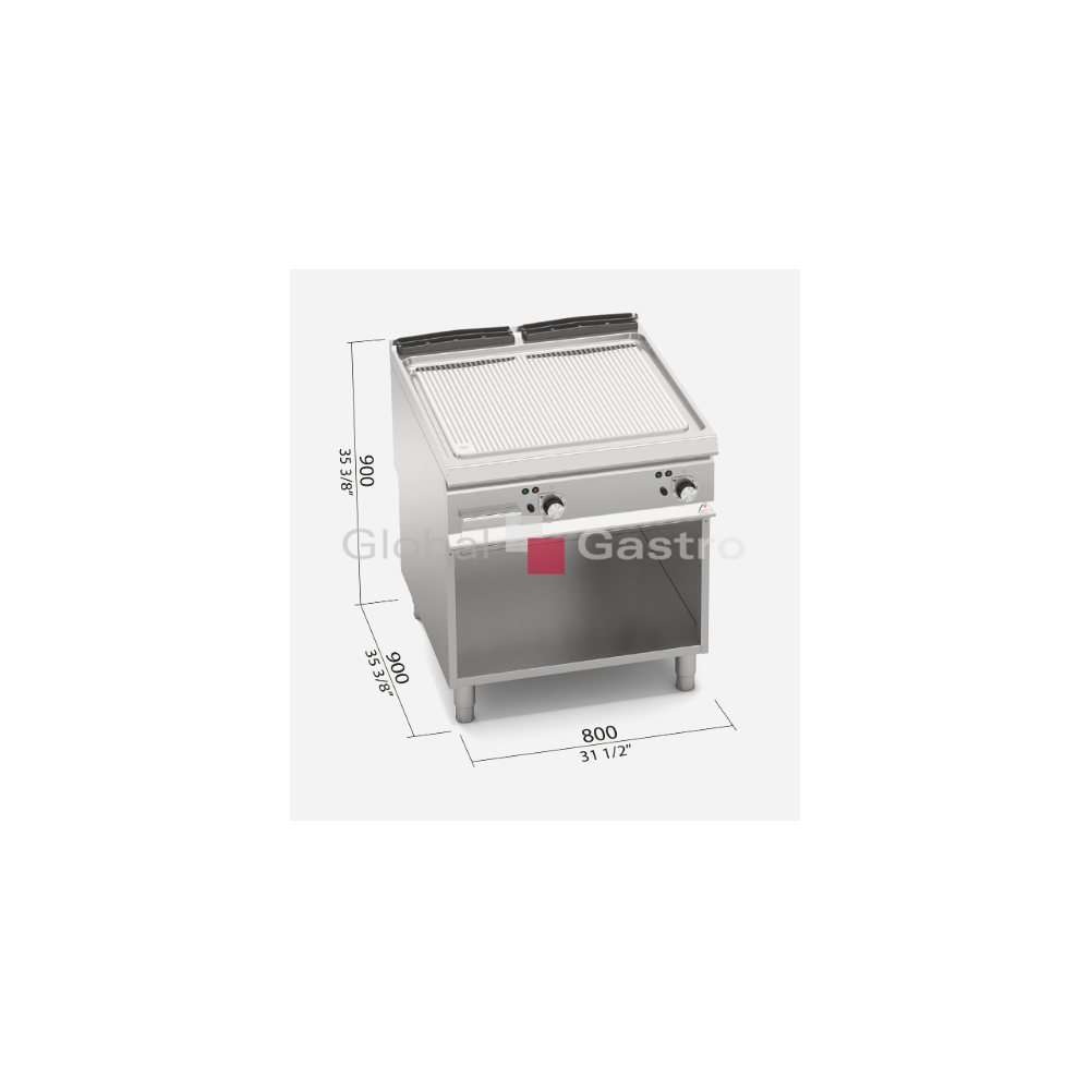 Topné těleso z oceli Incoloy s obzvlášť velkým průměrem je umístěno pod grilovací plotnu. Dvě zóny s nezávislým ovládáním a přesnou regulací teploty. Dvojvrstvá grilovací plotna složená z ocelového plátu a horní vrstvy z nerez oceli AISI 316 s leštěným povrchem, který umožňuje snadné čištění. Nízká úroveň odlesku zvyšuje komfort při práci. Zvýšené postranní lemy. Kompaktní provedení s otevřeným podstavcem. Kompletní sortiment plynových a elektrických ploten s různým provedením grilovací plochy. Lze na nich připravovat pokrmy tzv. "kontaktem" a to nejcitlivějším způsobem. Jednotný systém distribuce tepla zaručuje rovnoměrné grilování po celé pracovní ploše, velké energetické úspory a zlepšení pracovního prostředí. Při grilování se přirozeně tvoří zbytkový olej, který je odváděn a shromažďován ve velké odpadní nádobce. Teflonová zátka, odolná vůči vysokým teplotám není součástí smažící plotny.