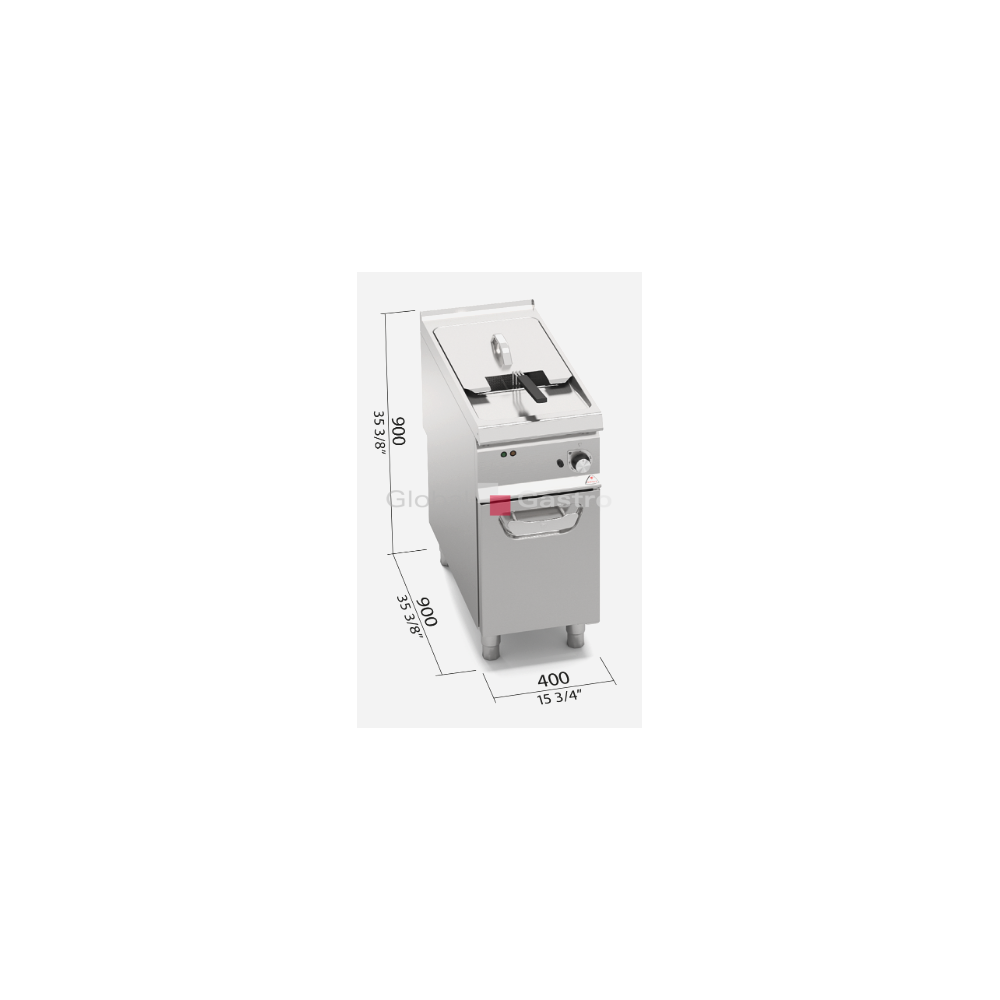Topné těleso umístěné přímo ve vaně. Snazší čištění umožňuje odklopení topného tělesa směrem nahoru. Bezpečnostní zařízení pro přerušení napájení při odklopení spirály nahoru. Kontrola teploty termostatem od 80 °C až 190 °C s přesnějším zjišťování teploty díky senzorům umístěným ve vaně. Světelná signalizace ovládání s indikátorem teploty. Pracovní plocha z nerez oceli AISI 304 tloušťka 20/10, přední a boční panely z nerezové oceli AISI 304. Vana nerez ocel AISI 304 se zaoblenými hranami a studenou zónou pod topným tělesem pro slévání zbytků. Na vrcholu s odsazenou mírně nakloněnou hranou navazující na koš a odpadním otvorem pro odtok přebytečného oleje do sběrné nádoby. Vypouštění kohoutem s tepelně odolným držadlem. Na vrchu se zaoblenou hranou pro zavěšení koše při skapávání oleje.