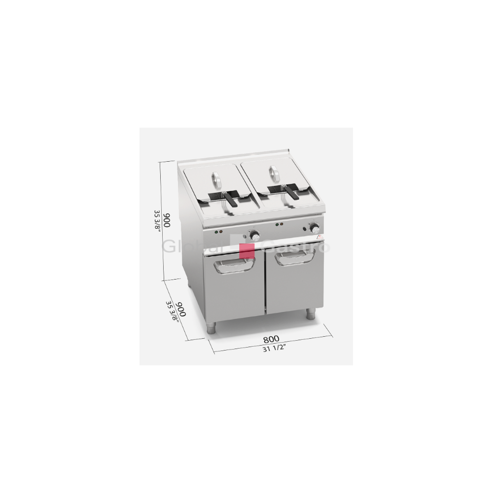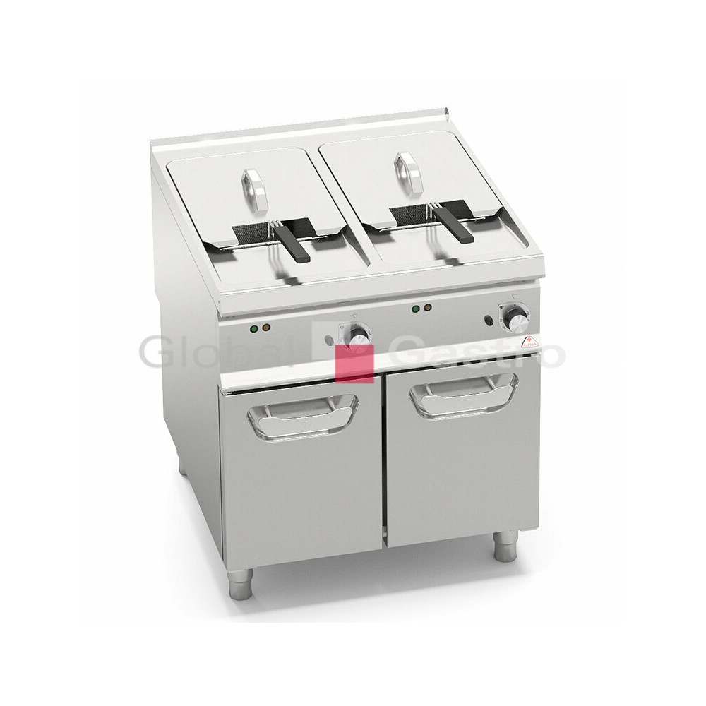 Dvě vany s nezávislým ovládáním pro optimální regulaci teploty. Topné těleso umístěné přímo ve vaně. Snazší čištění umožňuje odklopení topného tělesa směrem nahoru. Bezpečnostní zařízení pro přerušení napájení při odklopení spirály nahoru. Kontrola teploty termostatem od 80 °C až 190 °C s přesnějším zjišťování teploty díky senzorům umístěným ve vaně. Světelná signalizace ovládání s indikátorem teploty. Pracovní plocha z nerez oceli AISI 304 tloušťka 20/10, přední a boční panely z nerezové oceli AISI 304. Lisovaná vana z nerez oceli AISI 304 s oblýma hranama pro snadné čistění. Na pracovní desce umístěné ramínko pro napouštění vody ovládané kohoutem na čelního panelu s přepadem do nádrže. Vypouštění kulovým kohoutem s tepelně odolným držadlem.