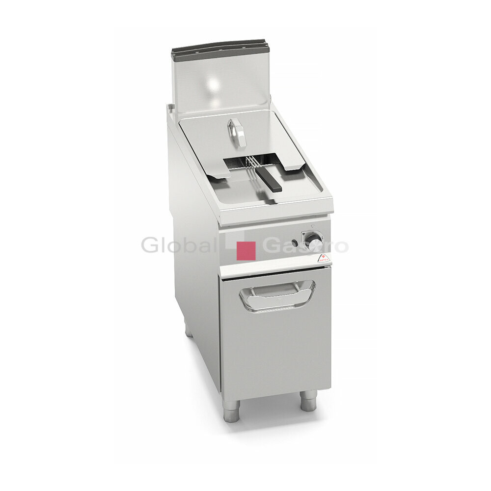 Pracovní plocha z nerez oceli AISI 304 tloušťka 20/10, přední a boční panely z nerezové oceli AISI 304. Nerezový oválný voštinový hořák zajišťuje rovnoměrný ohřev velké plochy přes výměník tepla umístěný přímo ve vaně. Chráněný zápalný plamínek s pojistným ventilem. Piezoelektrické zapalování s gumovou ochranou. Vana nerez ocel AISI 304 se zaoblenými hranami, studená zóna pod hořákem pro slévání zbytků. Na vrchu se zaoblenou hranou pro zavěšení koše při skapávání oleje.