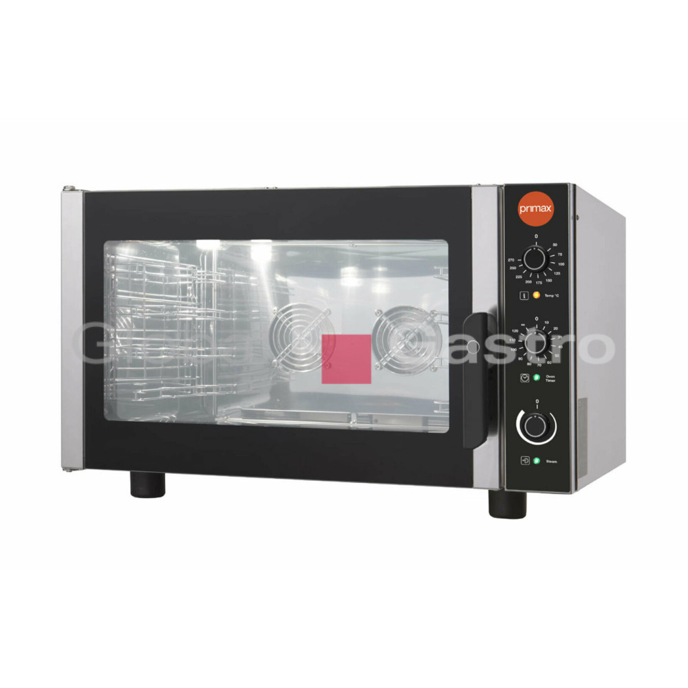 Nová řada elektrických konvekčních pekařských a cukrářských pecí PRIMAX EASY VALUE je navržena s ohledem na maximálně snadné ovládání (elektromechanické ovládání) a uživatelské prostředí, jednoduché pečící procesy při zachování požadovaných výsledků a permanentní kvality pečení. Pece PRIMAX jsou výkonné a zaručují optimální rovnoměrnost pečení v každém prostředí a při jakémkoli množství vloženého produktu. Pekařské a cukrářské pece PRIMAX EASY VALUE se snadným elektromechanickým ovládácím panelem (dokonalé spojení jednoduchosti a výkonu) jsou připraveny Vám poskytnout bez zbytečností vše to, co od profesionání pece požadujete a jsou ideální pro přípravu pečiva a mražených produktů v supermarketech a obchodech se smíšeným zbožím. Pekařské a cukrářské pece předního Italského výrobce firmy Primax jsou vyrobeny v Itálii z evropských komponentů a kvalitních nerezových materiálů, sestaveny pod přísnou kontrolou v moderním funkčním designu. Pece EASY VALUE jsou ideálním řešením pro profesionální provozy k přípravě čerstvého, nebo zmraženého pečiva a dalších produktů. Celonerezové provedení AISI 430, izolovaná komora (keramická vlákna), nerezový varný prostor (nerez AISI 304) se zaoblenými hranami a lisovaným dnem. Snadné manuální ovládání s nastavení teploty 50°- 270°C, nastavením času 0 - 120 min. a trvalý chod (nekonečno). Kontrolky jednotlivých ovladačů signalizují chod a připravenost dané funkce. Model je v provedení se snadným "regulovatelným" zlhčováním (umožňuje snadné nastavení množství páry/vlhkosti v komoře) pomocí otočného ovladače. Optimální prodění vzduchu a teplotu zajišťují dva výkonné "reverzní" nerezové ventilátory (2x 240W) a výkonná nerezová tělesa Incoloy 800 (6kW). Komora je vybavena vnitřním osvětlením a snadno vyjímatelným odolným těsněním. Odvětrávaná křídlová dvířka (levé otevírání) s dvojitým sklem a bezpečnostní ergonomickou klikou. Nerez vyjímatelné zásuvy s optimální roztečí 75 mm. Kapacita: 4 plechy EN 600x400mm (případně GN1/1) Celonerezové provedení AISI 430 nerezový varný prostor AISI 304 se zaoblenými hranami izolovaná varná komora (keramická vlákna) snadné elektromechanické ovládání nastavení teploty 0-270°C nastavení času 0-120min + nekonečno regulátor pro nastavení zvlhčování do komory výkonná nerezová topná tělesa Incoloy 800 výkonné nerezové ventilátory s reverzním chodem vnitřní halogenové osvětlení snadno vyjímatelné těsnění varné komory odvětrávaná křídlová dvířka s dvojitým sklem nerez vyjímatelné zásuvy s roztečí 75mm model umožňující připojení na vodu a odpad přípojka na vodu (3/4" / požadovaný tlak 1,5-2,5 bar a trvdost 4-12°F) komora vybavena nerezovou odpadní trubkou (Ø 40mm odvod vody z komory).