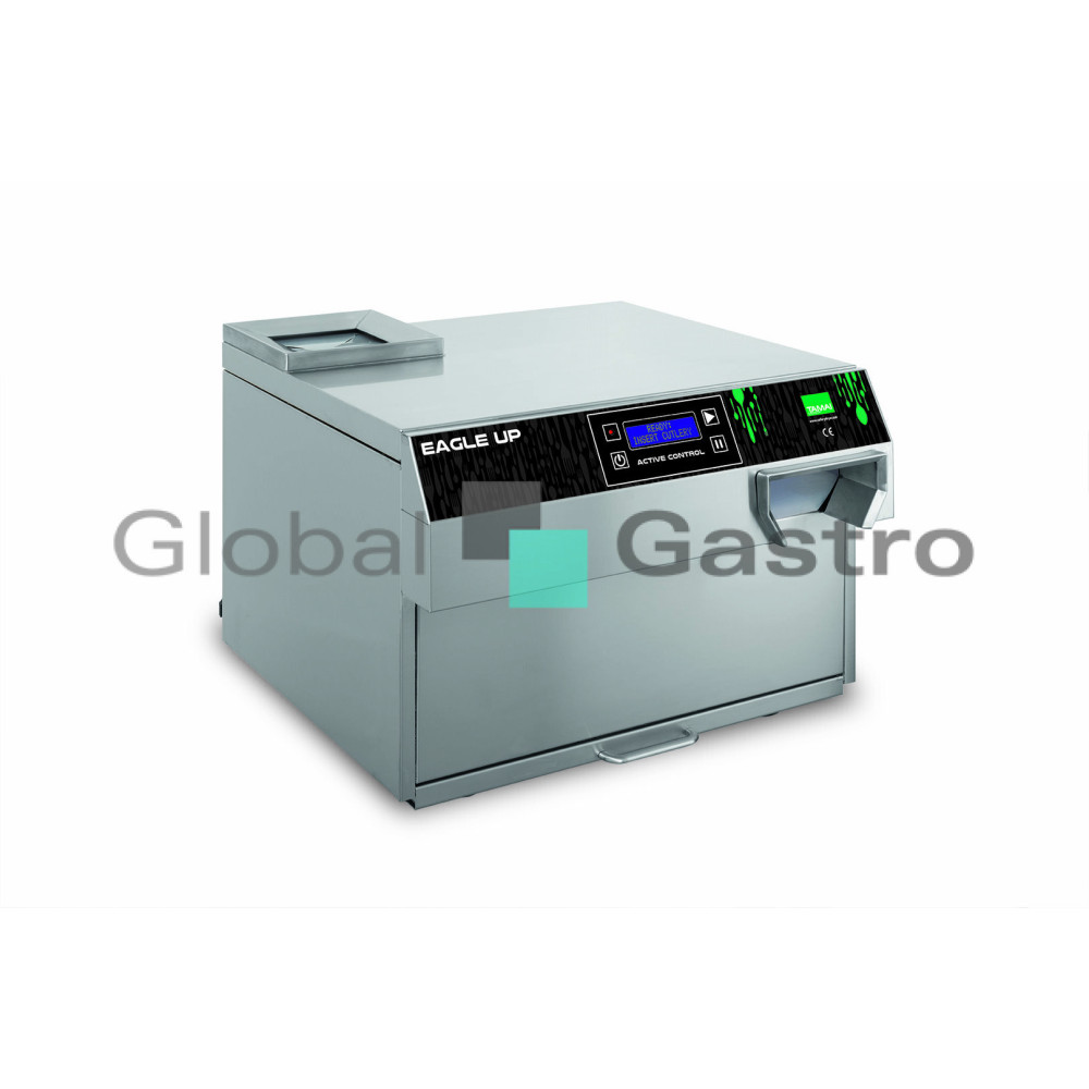 Nová řada automatických leštiček příborů TAMAI EVOLUTION využívající technologii ACTIVE CONTROL, která umožňuje jednoduše a intuitivně sledovat provozní fáze leštičky příborů přímo z ovládacího panelu. Nový přehledný elektronický ovládací panel je vybaven LCD displejem, který zobrazuje různé provozní fáze během provozního cyklu (např.fázi předehřevu, připravení k provozu, režim STAND-BY, nebo potřebu vyměnit kukuřičný leštící a sušící kukuřičnou náplň). Díky těmto inovacím a již prokázanému vynikajícímu výkonu jsou naše stroje ještě konkurenceschopnější a všestrannější. Výkon modelu TAMAI EAGLE EVO je cca 5 až 6000 kusů příborů za hodinu. Uvedený model je doporučen pro provozy s kapacitou do 250 míst.