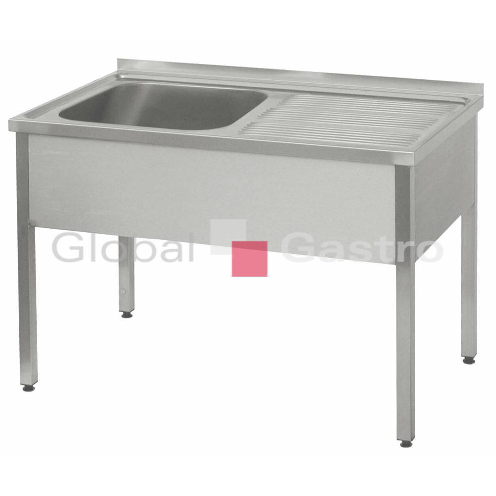 Celonerezové provedení s vevařenou lisovanou vanou a odkapovou plochou na levé straně, opláštěním čela, boků a zadním lemem vysokým 40 mm, tloušťka materiálu 1 mm. Stavitelné nohy. Základní provedení bez trnoží. Součástí dřezu není sifon.. Tuhá svařená konstrukce.
