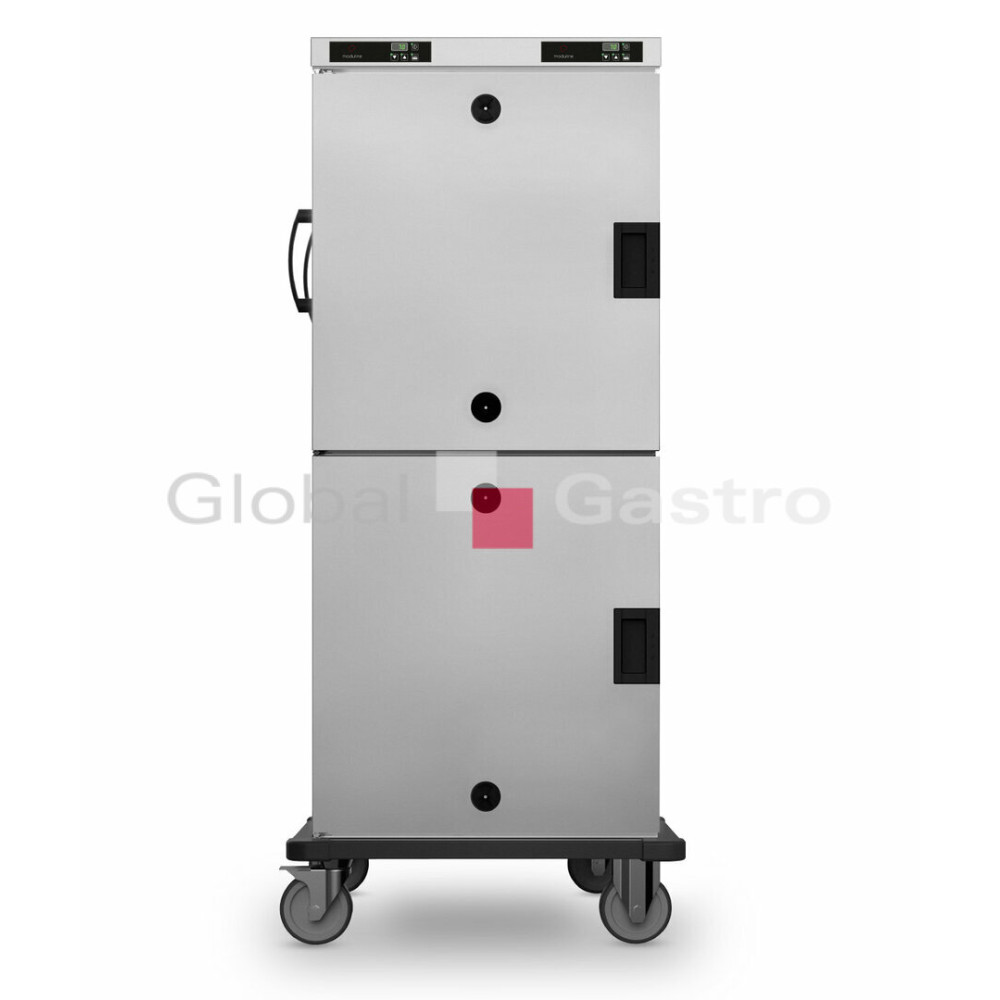 Transportní vozík HHT-282EP slouží pro udržování potravin v teplém stavu. Přesné elektronické nastavování teploty od 30 – 120°C. Ve dveřích umístěny dva ventilační otvory pro manuální odvlhčení komory. Statický kruhový topný systémem šetrného ohřevu využívána udržuje optimální vlhkost uložených potravin. Kvalitní těsnění komory, oválné rohy, vyjímatelné vnitřní zásuvy. Rozdělené dveře a samostatně oddělené komory pro snížení tepelných ztrát při otevírání a regulaci teploty v každé komoře samostatně. Dveře s možností změny otevírání vlevo či vpravo a vybaveny odolným těsněním. Ochrana rohů z plastu. Robustní kola 4x150mm, dvě z nich brzděná. Ergonomické madlo pro snadnou ovladatelnost vozíku. Snadná servisní údržba.