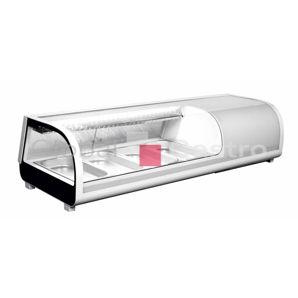 Pultová chladicí vitrína délky 1177mm je určena k prezentaci a prodeji různých potravin (včetně SUSHI). Elegantní bílo šedé provedení, oblé čelní sklo, ze strany obsluhy 2 posuvná dvířka,vybavena intenzivním LED osvětlením, které neohřívá vnitřní prostor a výrazněnapomáhá prezentaci uložených potravin. Vitrína je ovládána digitálním regulátorem, displejem zobrazujícím teplotu (HACCP),se systémem automatického odtávání, vana v nerezovém provedení vybavena čtyřmi nádobami GN1/3 s hloubkou 40mm.