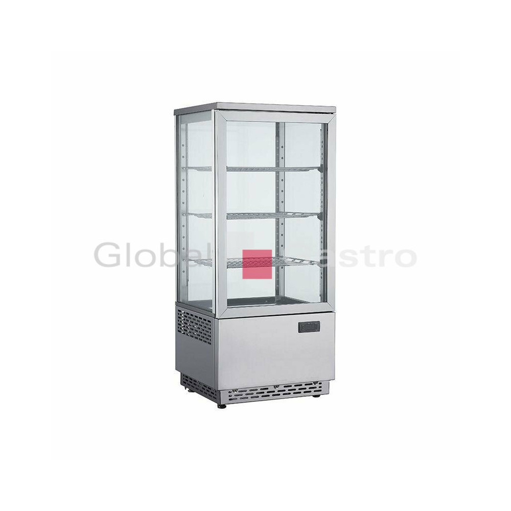 Chladicí panoramatická vitrína RT-78L-8 v elegantním nerezovém provedení určena k prezentaci, uskladnění a prodeji potravin. Vitrína je ze čtyř stran prosklená (dvojitá izolovaná skla) s intenzivním 4x LED rohovým osvětlením, která neohřívá vnitřní prostor a výrazně napomáhají prezentaci a prodeji ve všech patrech. Ovládána digitálním regulátorem s displejem zobrazujícím teploty. Systém automatického odtávání, masivní chromové police (výškově stavitelné). Nastavitelné nožičky.
