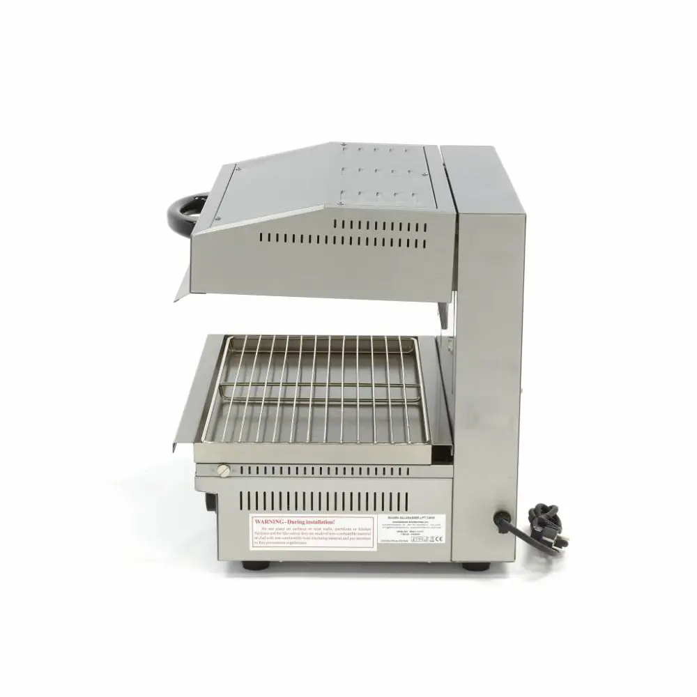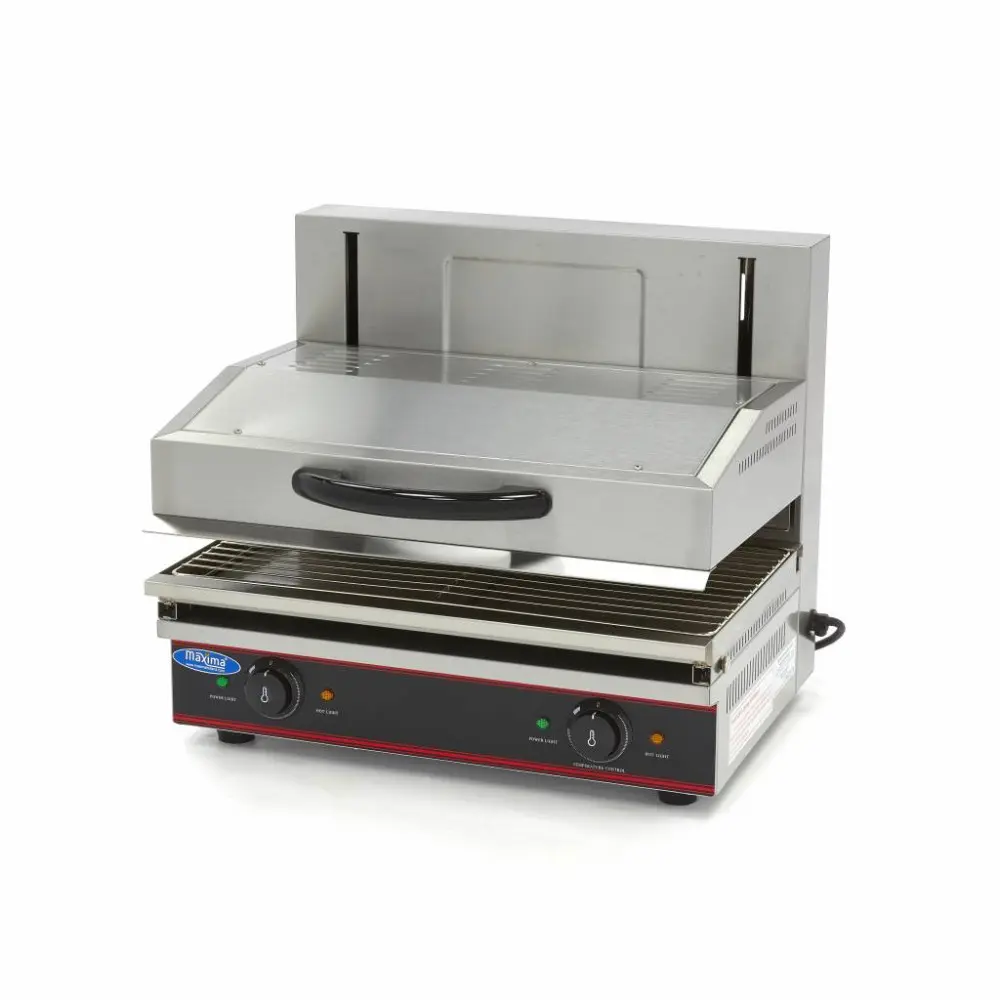 Tento profesionální salámový gril je vybaven zvedacím systémem. To znamená, že nemusíte pohybovat roštem s jídlem, ale přiblížíte topná tělesa k jídlu posunutím horní části dolů pomocí páky. To je ideální pro gratinování pokrmů. Poté můžete horní část opět posunout nahoru pomocí páky. Topná tělesa jsou odolná a legovaná a spotřebič je vybaven ukazatelem teploty. Mřížka je vyrobena z nerezové oceli, na kterou lze umístit výrobky, nádobí a potraviny. Ve spodní části se nachází nerezový tácek na drobky pro zachycení zbytků jídla. Rukojeť na horní straně grilu salamander je vyrobena z izolačního bakelitu.