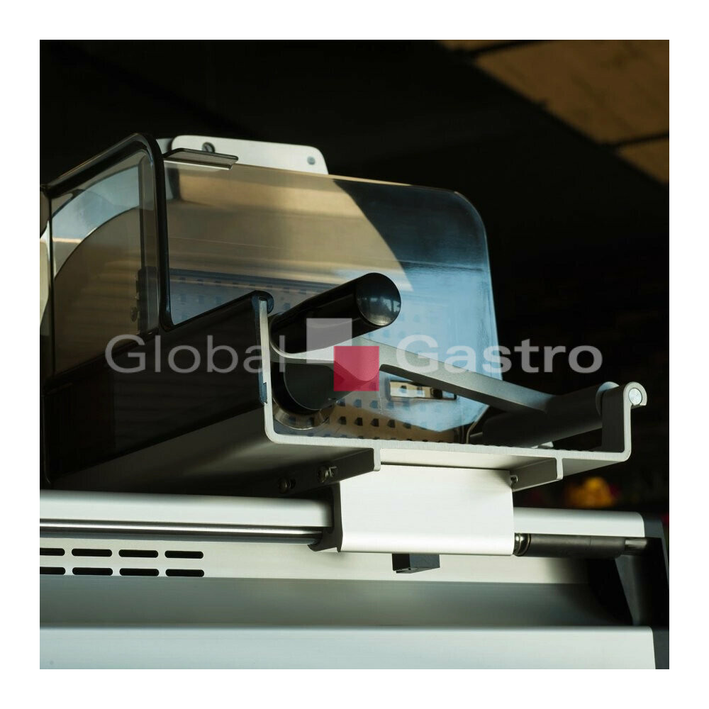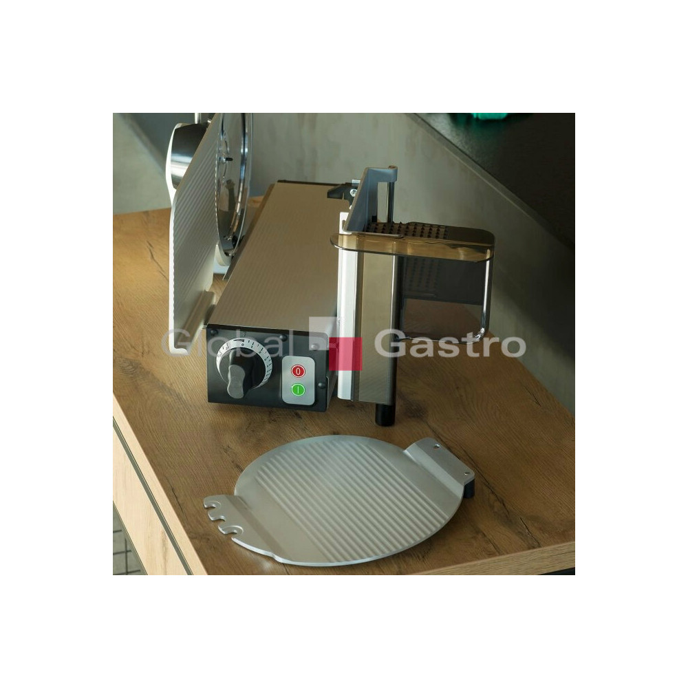 Nářezový stroj manuální pro profesionální použití na porcování a krájení různých produkt (uzeniny, maso, sýr, chléb, zeleninu a ovoce). Vhodný pro gastronomické provozy a menší prodejny. Opravdový multitalent se šírokým spektrem využití. Promyšlená konstrukce stroje zabezpečí nejlepší výsledky krájení, optimální přístup a komfort při čistění. Vysoký hygienický standard. Účinný systém chlazení motoru a hybridní pohon (šneková převodovka pohánějící klínový řemen) umožňuje efektivní a bezúdržbový přenos energie i při nepřetržitém provozu. Důmyslný "L" design umožňuje šikovnou kombinaci a těsné seskupení s úložnými tácky, krájecími deskami, nebo s váhou atd. Maximální řezná kapacita s minimální stopou, přesné a praktické nastavení tloušťky řezu od 0 až do 20mm.