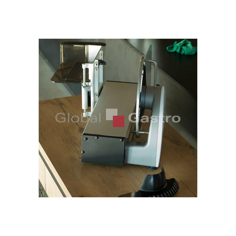 Nářezový stroj manuální pro profesionální použití na porcování a krájení různých produkt (uzeniny, maso, sýr, chléb, zeleninu a ovoce). Vhodný pro gastronomické provozy a menší prodejny. Opravdový multitalent se šírokým spektrem využití. Promyšlená konstrukce stroje zabezpečí nejlepší výsledky krájení, optimální přístup a komfort při čistění. Vysoký hygienický standard. Účinný systém chlazení motoru a hybridní pohon (šneková převodovka pohánějící klínový řemen) umožňuje efektivní a bezúdržbový přenos energie i při nepřetržitém provozu. Důmyslný "L" design umožňuje šikovnou kombinaci a těsné seskupení s úložnými tácky, krájecími deskami, nebo s váhou atd. Maximální řezná kapacita s minimální stopou, přesné a praktické nastavení tloušťky řezu od 0 až do 20mm.
