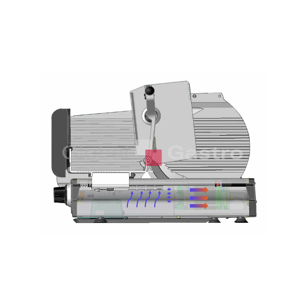 Pohon nářezového stroje zajišťuje výkonný 300 W motor (tichý, účinný, dobře chlazený hybridní pohon umožňuje efektivní a bezúdržbový přenos energie i při nepřetržitém provozu)