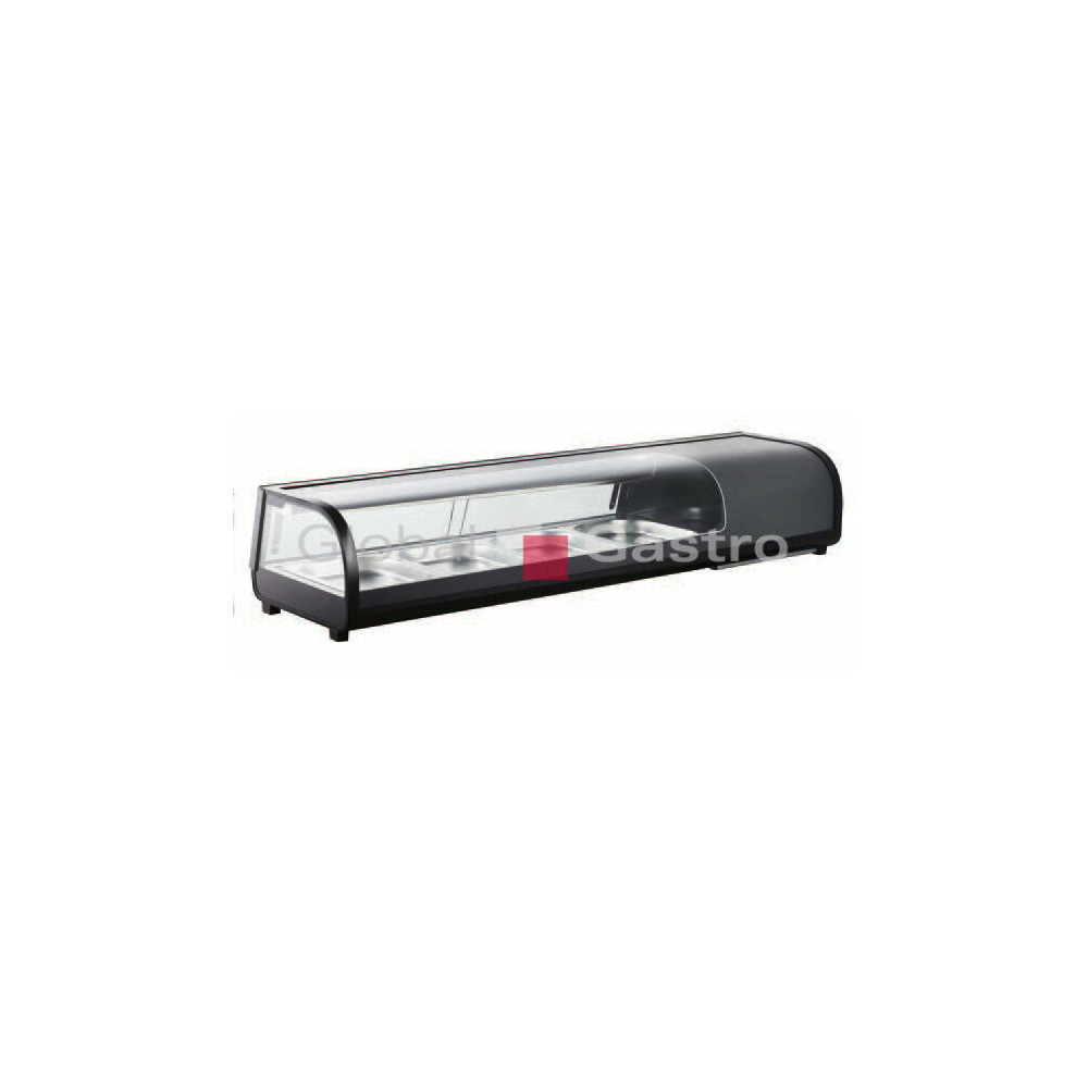 Pultová chladicí vitrína délky 1177mm je určena k prezentaci a prodeji různých potravin (včetně SUSHI). Elegantní bílo šedé provedení, oblé čelní sklo, ze strany obsluhy 2 posuvná dvířka,vybavena intenzivním LED osvětlením, které neohřívá vnitřní prostor a výrazněnapomáhá prezentaci uložených potravin. Vitrína je ovládána digitálním regulátorem, displejem zobrazujícím teplotu (HACCP),se systémem automatického odtávání, vana v nerezovém provedení vybavena čtyřmi nádobami GN1/3 s hloubkou 40mm.
