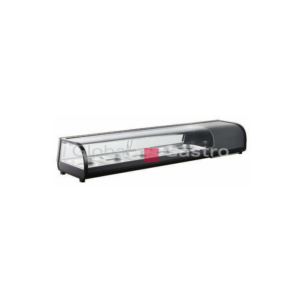 Pultová chladicí vitrína určena k prezentaci a prodeji různých potravin (včetně SUSHI). Elegantní bílo šedé provedení, oblé čelní sklo, ze strany obsluhy 2 posuvná dvířka, vybavena intenzivním LED osvětlením, které neohřívá vnitřní prostor a výrazněnapomáhá prezentaci uložených potravin. Vitrína je ovládána digitálním regulátorem, displejem zobrazujícím teplotu (HACCP),se systémem automatického odtávání, vana v nerezovém provedení vybavena pěti nádobami GN1/3 s hloubkou 40mm.