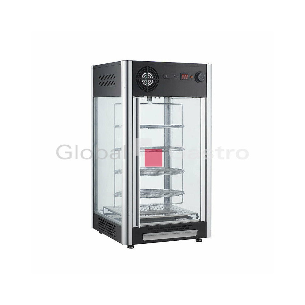 Vyhřívaná panoramatická vitrína s otočným uložením polic, určena k prezentací pokrmů. Vitrína je v elegantním nerezovém provedení ze všech stran prosklená s intenzivním LED osvětlením, které napomáhá prezentaci a prodeji potravin ve všech patrech. Posuvné dveře ze strany obsluhy. Vitrína je ovládána mechanickým termostatem (od 30 do 90°C) a mechanickým teploměrem na čelním panelu.