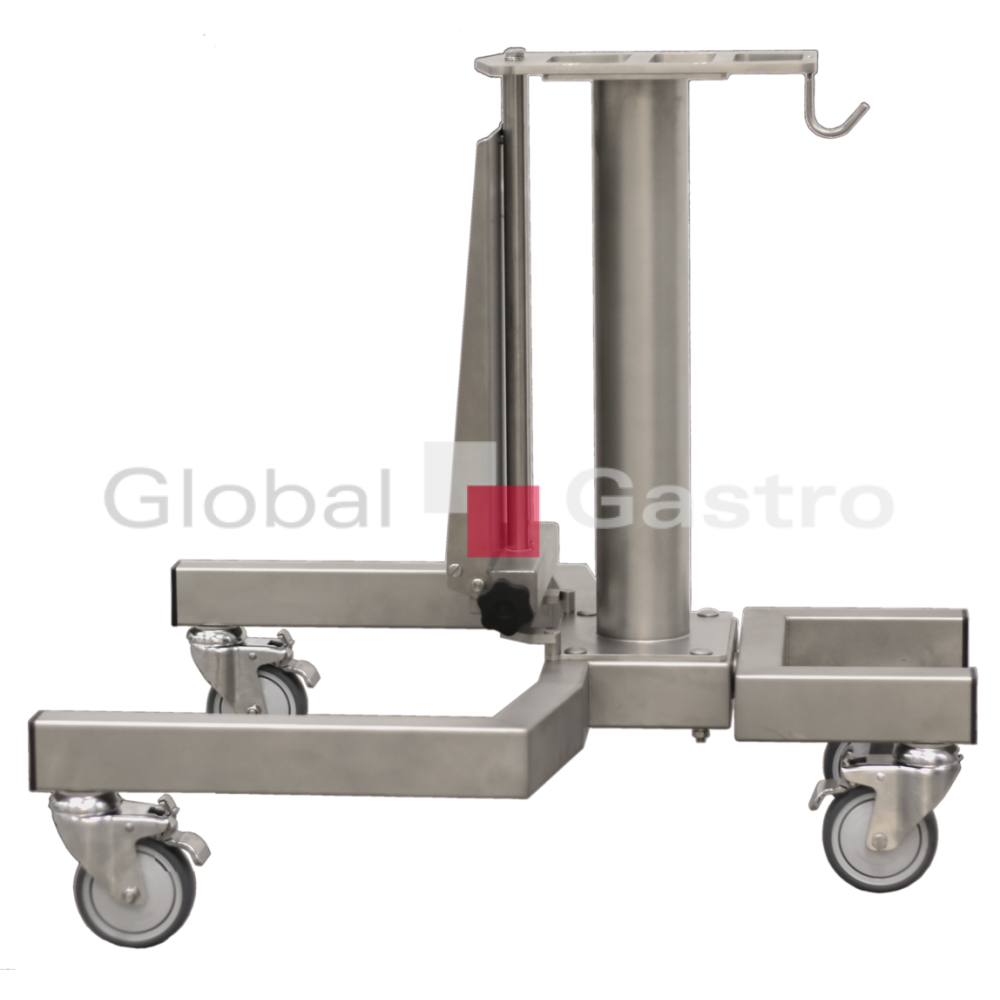 Model FGA - stabilní nerezová trubková konstrukce s odkládací plochou (např. pro mísu), 3 vodící pojezdová kolečka s pryžovými obručemi (všechna s možností zajištění).