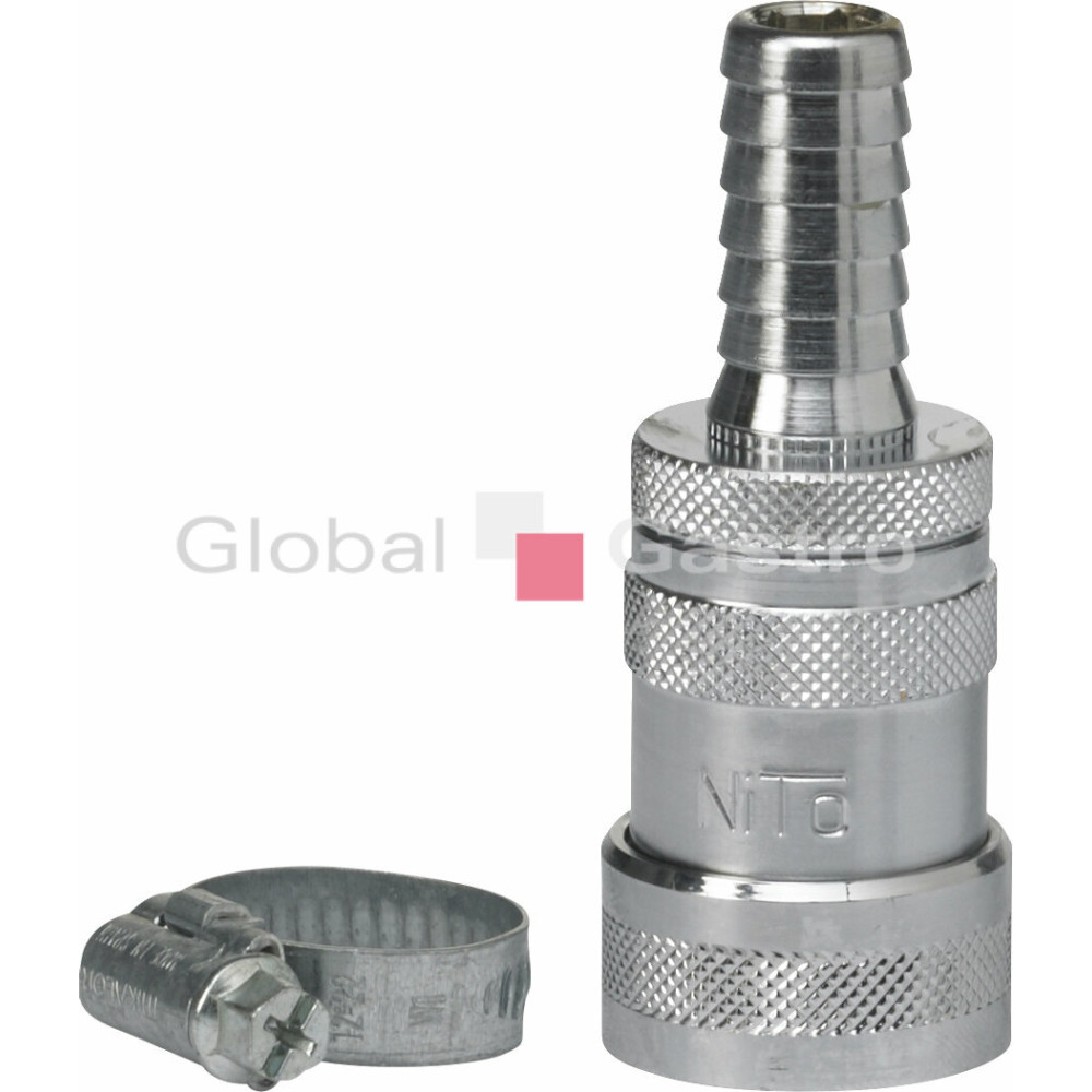 1/2" spojka "Q" s hadicovou vsuvkou 1/2" a uzavíracím ventilem při odpojení hadice. Hadicová svorka je součástí dodávky. Nízký obsah olova.