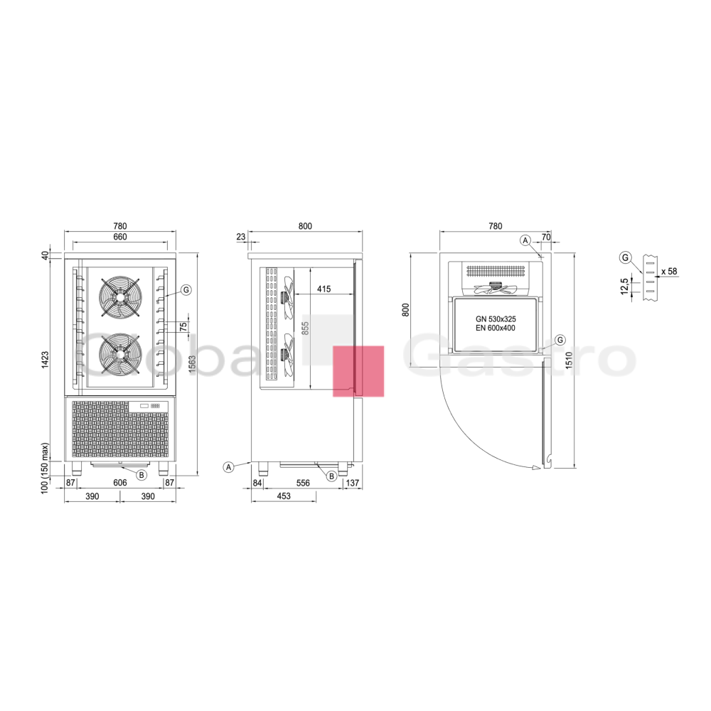 Model pro 5 plechů (GN1/1) je dodáván s nerezovým vyjímatelným zásuvným rámem.