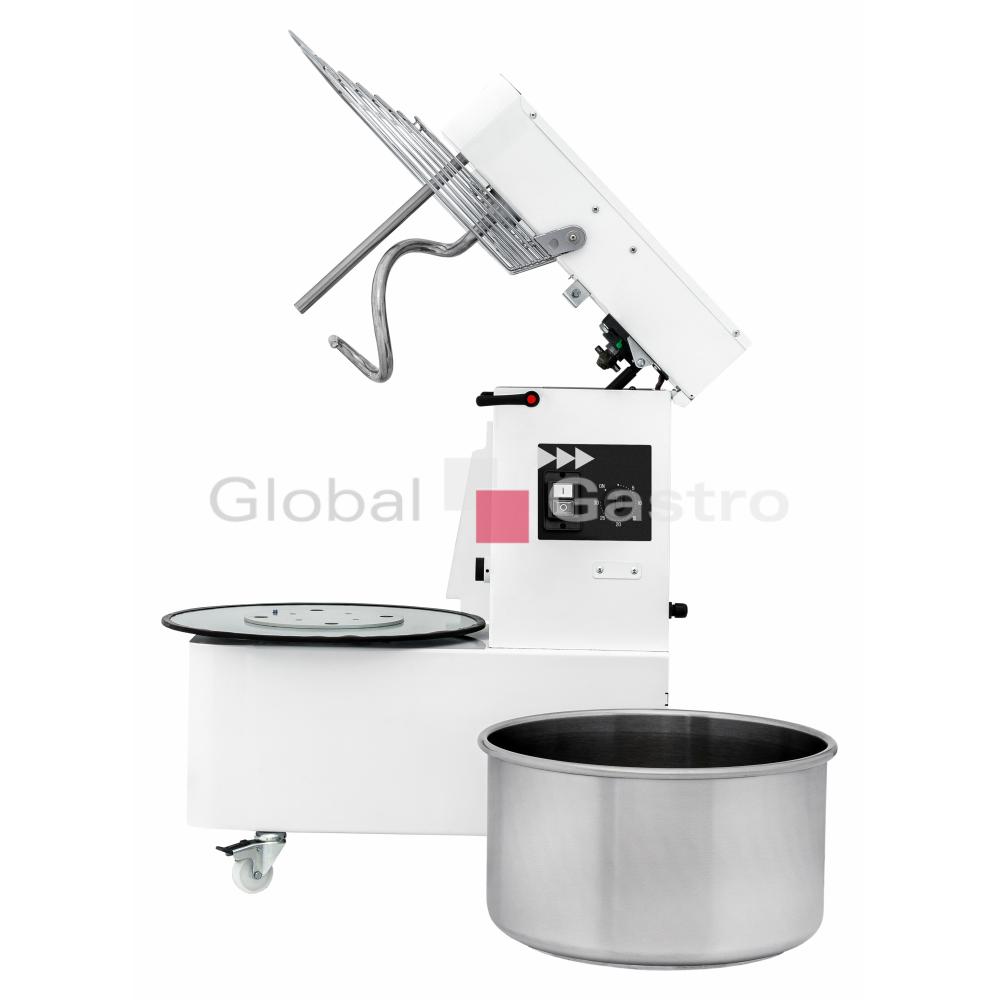 Robustní tělo stroje je z ocelového plechu s povrchovou úpravou zajišťující dlouhou životnost. Mísa, spirála, centrální hřídel i ochranná mřížka jsou vyrobeny z nerezové oceli AISI 304, která splňuje přísné hygienické standardy potravinářského provozu. Model je vybaven dvourychlostním třífázovým motorem s převodovkou v olejové lázni, což zajišťuje plynulý přenos točivého momentu, minimální hlučnost a zanedbatelnou údržbu. Spirála a centrální hřídel zajišťují rovnoměrné promísení těsta během několika minut – bez zahřívání surovin a s ideálním provzdušněním.