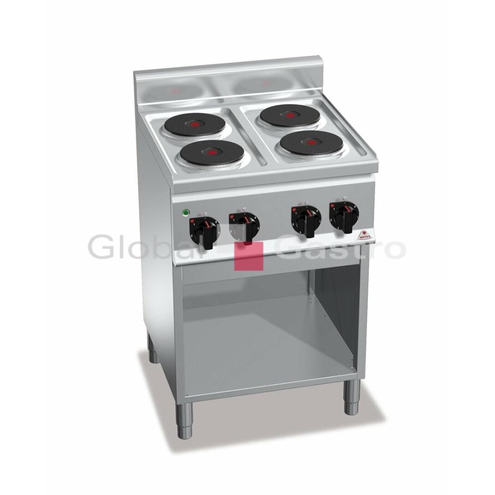 Elektrické sporáky jsou vybaveny kulatými litinovými plotnami Ø 180 mm a výkonem 2 kW. Teplota je regulována nezávisle nastavitelnými spínači. Kompaktní provedení s otevřeným podstavcem. Elektrická konvekční trouba vhodná pro GN 1/1 s kvalitním těsněním dveří.