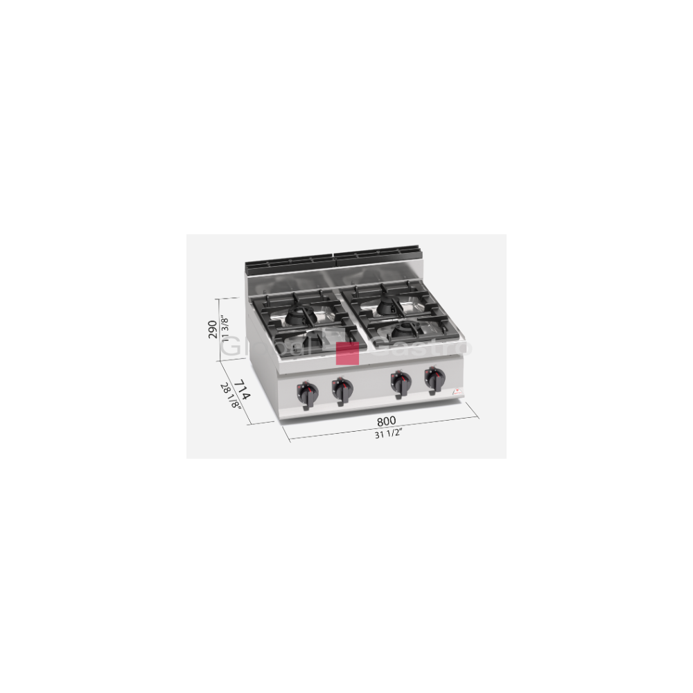 Pracovní plocha a opláštění z nerez oceli AISI 304. Výkonné litinové hořáky HIGH POWER, snadno demontovatelné a umístěné ve vyjímatelných prolisovaných smaltovaných (nerezových) odkapových vanách. Zapalování hořáků věčným plamínkem.