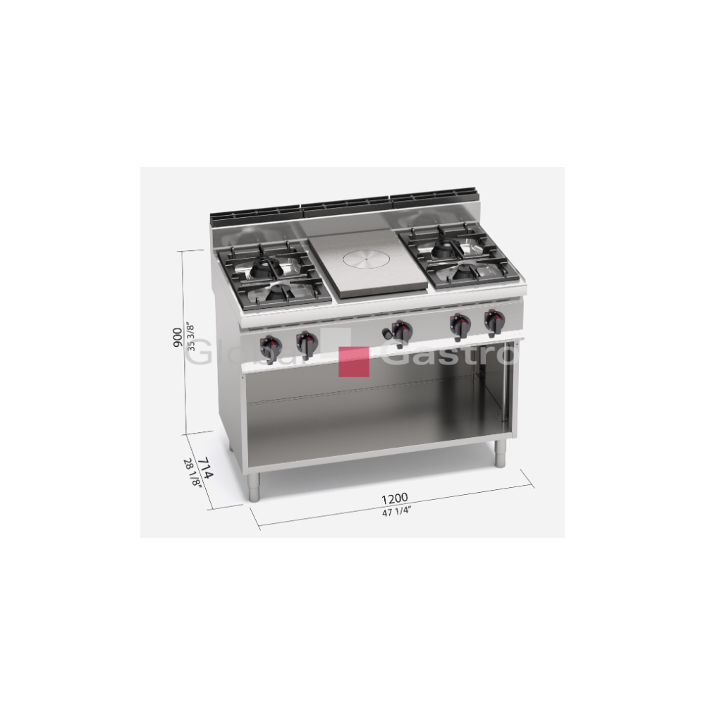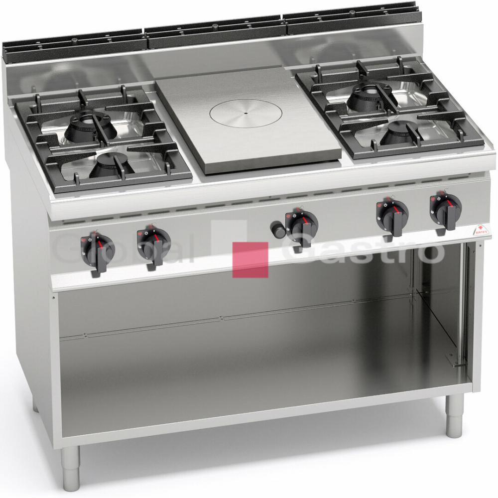 Plynový sporák s ocelovou plotnou velké tloušťky s rozdílnými oblastmi teplot: max. teplota na středu, klesající na okrajích. Ohřev zajišťuje střední litinový hořák 7kW s regulací výkonu. Zapalování hořáků věčným plamínkem. Kompaktní provedení s otevřeným podstavcem.