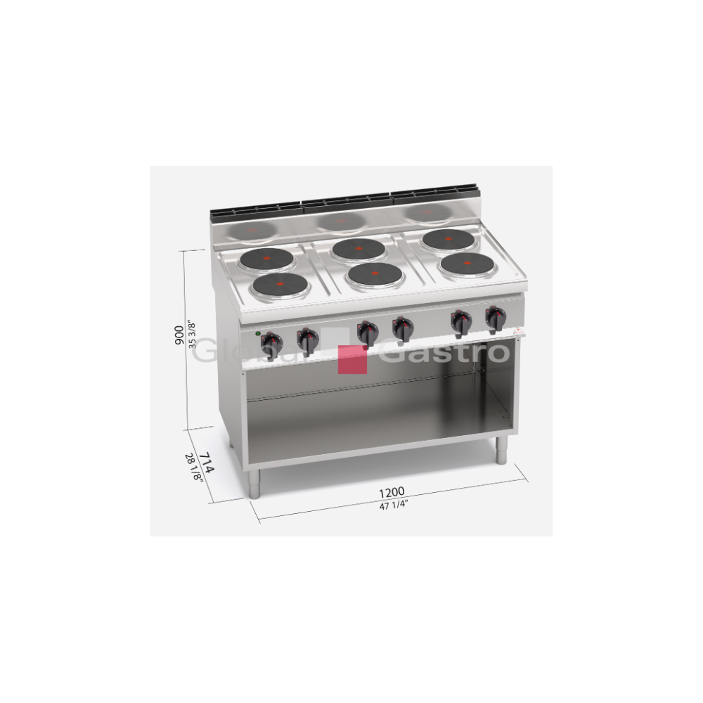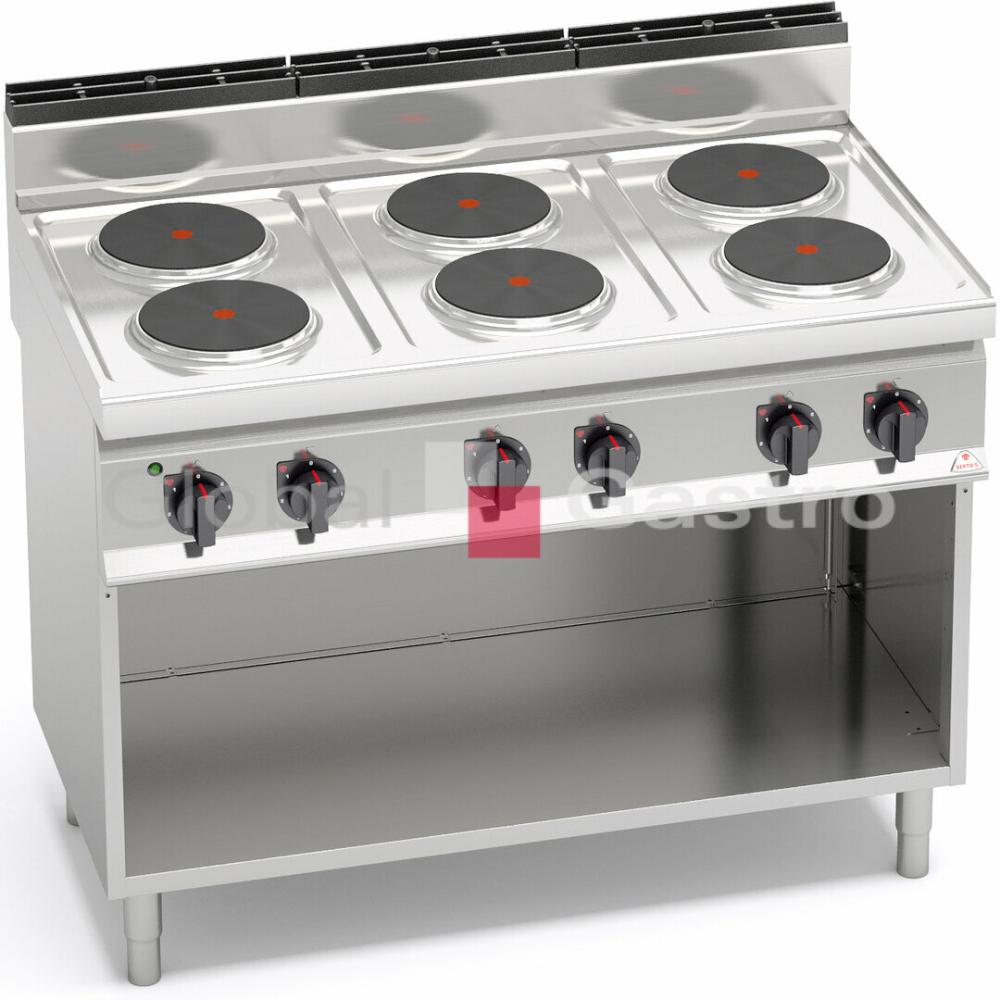 Pracovní plocha a opláštění z nerez oceli AISI 304. Litinové varné plotýnky s bezpečnostním termostatem a regulací výkonu. Kompaktní provedení s otevřeným podstavcem.