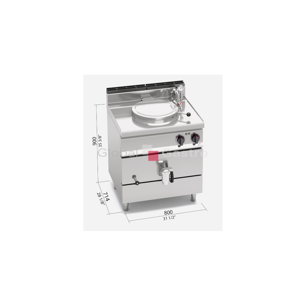 vyrobena z nerez oceli AISI 316 o tloušťce 15/10 se zesíleným dnem 20/10. Ovládání výkonu nebo regulace teploty pomocí termostatu. Kotle jsou vybaveny baterií s napuštěcím raménkem a bezpečnostním výpustným kohoutem 1 1/2”.