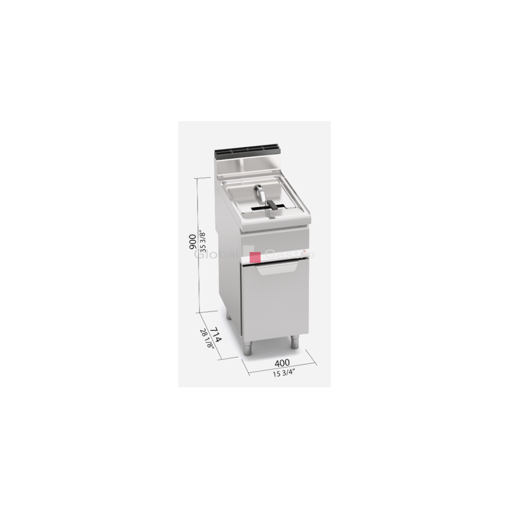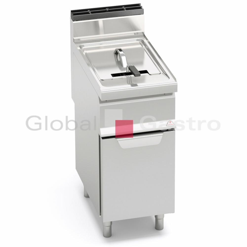 Elektrické a plynové fritézy z nerez oceli AISI 304. Jedna nebo dvě lisované vany se studenou zónou pro zachycení zbytků jídel. Přímý ohřev trubkovými hořáky ve vaně nebo elektrickými topnými spirálami, vybaveny bezpečnostní termostaty. Plynulé nastavení výkonu, nebo teploty do 190°C. Teoretický výkon 1 vana (plynová frytéza 25 kg/h a elektrická 30 kg/h). Dodáváno s křídlovými dvířky a jedním základním košem/vana (Příplatkově VYŠŠÍ VÝKON U ELEKTRICKÝCH MODELŮ 9 kW/2x 9kW, C2 = 2koše/vana).