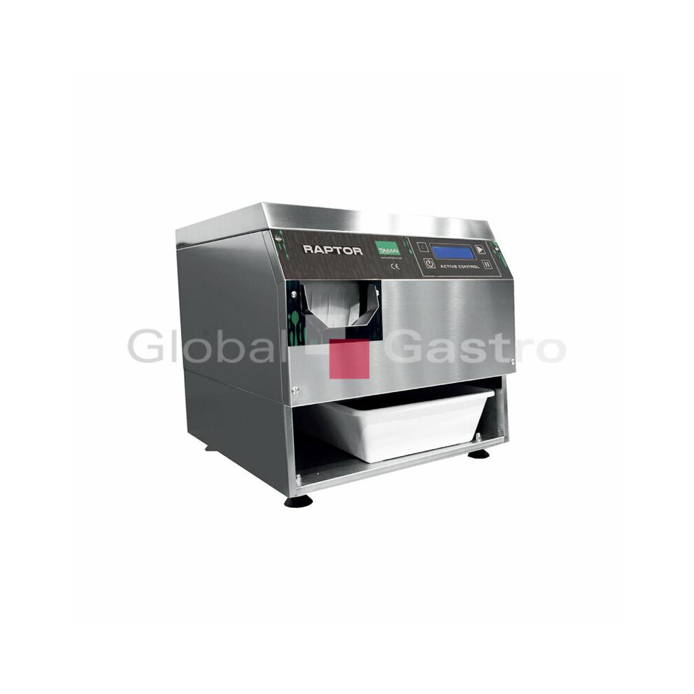 Model RAPTOR může být díky plnícímu a výstupnímu otvoru umístěnému z čela zabudován do pracovního stolu, nebo na pojízdný podstavec pro snadnou manipulaci a transport (příplatkově). Nová řada automatických leštiček příborů TAMAI EVOLUTION využívající technologii ACTIVE CONTROL, která umožňuje jednoduše a intuitivně sledovat provozní fáze leštičky příborů přímo z ovládacího panelu. Nový přehledný elektronický ovládací panel je vybaven LCD displejem, který zobrazuje různé provozní fáze během provozního cyklu (např.fázi předehřevu, připravení k provozu, režim STAND-BY, nebo potřebu vyměnit kukuřičný leštící a sušící kukuřičnou náplň). Díky těmto inovacím a již prokázanému vynikajícímu výkonu jsou naše stroje ještě konkurenceschopnější a všestrannější. Výkon kompaktního modelu TAMAI RAPTOR 710 EVO je cca 3500 kusů příborů za hodinu. Uvedený model je doporučen pro provozy s kapacitou do 150 míst. Náplň : 4 kg kukuřičné drtě Automatická leštička příborů TAMAI EAGLE EVO v kompaktním celonerezovém provedení (AISI 304). Model RAPTOR 710 EVO je absolutní novinkou v oblasti leštiček příborů. Leštička je určena pro měnší a střední gastronomické provozy s kapacitou do 150 míst, výkon leštění je cca 3500 ks příborů za hodinu. Zařízení je tepelně a zvukově izolováno (opláštění pohlcující zvuk), tím přináší výraznou úsporu energie a zejména snížení hladiny hluku v provozovně. Je vybaveno novou elektronickou deskou EVO, která obsluhu snadno naviguje při ovládání stroje. Snadná obsluha a použití: umyté, mokré kusy příboru (5-7 najednou) se vloží do plnícího na čelním panelu sušičky, následně se samovolně posunou skluzavkou do nerezového vibračního tunelu s leštící náplní (sušená kukuřičná drť), vybaveným výkonným ventilovaným ohřevem (sušení a sterilizace) a vibračním motorem (leštění a posun příborů). Každý kus je perfektně vyleštěný: vysoká teplota udržuje kukuřičné granule stále suché, neporušené a připravené k leštění dalších a dalších kusů příborů. Příbory jsou automaticky vibračním leštícím procesem dopraven do výstupního otvoru ve spodní části přístupné opět z čela, odkud samovolně vypadávají do vložené plastové přepravky.