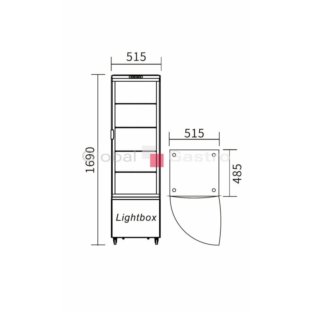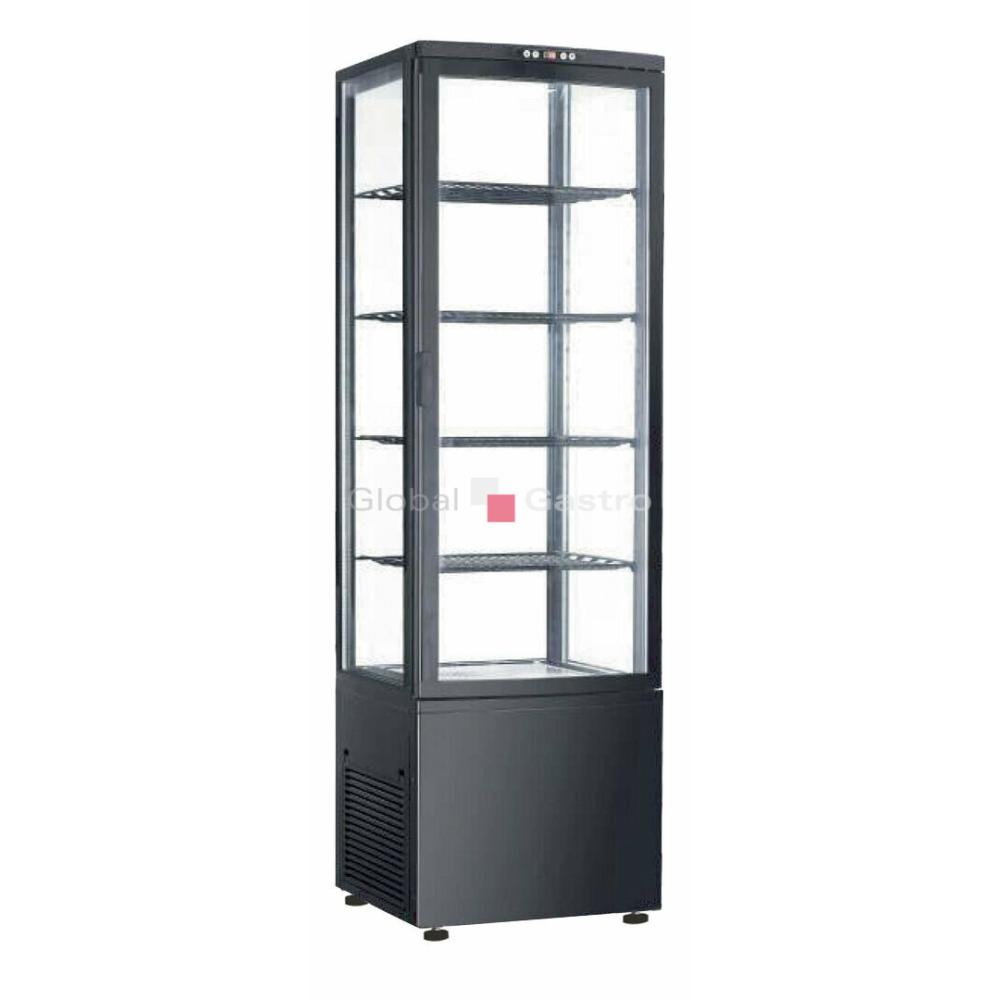 Chladicí panoramatická vitrína RT-235L, je určena k prezentaci, uskladnění a prodeji potravin a nápojů. Vitrína je v elegantním černém provedení ze všech stran prosklená, izolovaná dvojitá skla, přední strana s dvířky je v oblém provedení (včetně skla), intenzivní oboustranné 4× LED osvětlení (neohřívá vnitřní prostor a výrazně napomáhá prezentaci a prodeji potravin ve všech patrech. Vitrína je ovládána digitálním regulátorem se zobrazením teploty. Systém automatického odtávání, 4 chromové police (stavitelné). Vitrína je dodávána na stabilních regulovatelných nohách.