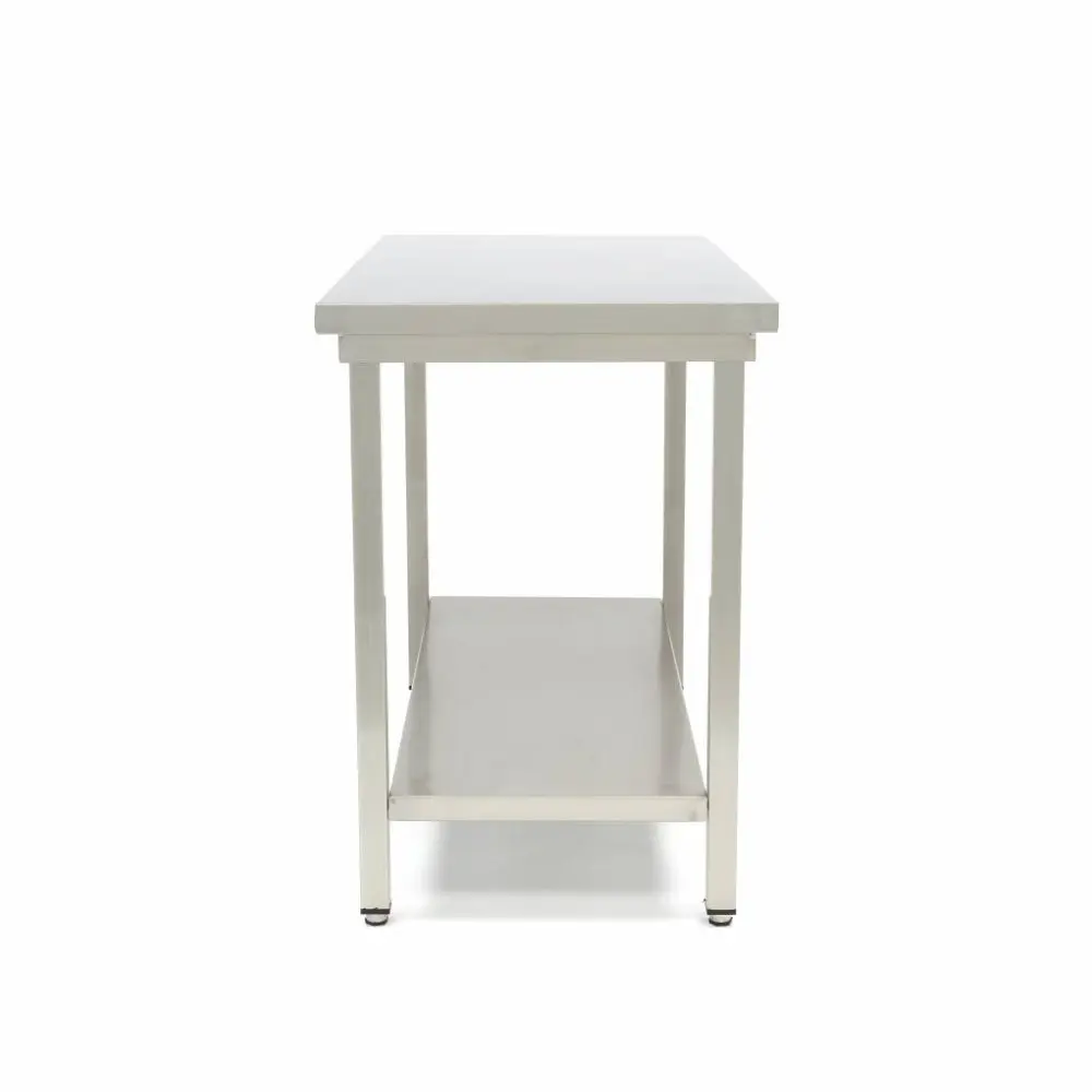Tento vysoce kvalitní pracovní stůl má pracovní desku se zalomenými okraji. Hrany jsou navíc svařované a leštěné. Úhledně dokončený pracovní stůl bez ostrých hran je nejlepší pro bezpečné pracovní prostředí. Tento pracovní stůl nemá zvýšený okraj v zadní části. Police pod ním nabízí prostor pro další úložné prostory a je ideální pro uložení kuchyňského náčiní. Pomáhá udržovat pracovní prostor čistý a prázdný. Podstavec stolu nelze výškově nastavit. Pracovní stůl se dodává v plochém balení, což znamená, že jej bude třeba sestavit. Díky dodávanému nářadí a velmi jednoduché montáži to není žádný problém. Během 10 minut je pracovní stůl z nerezové oceli připraven k použití v kuchyni