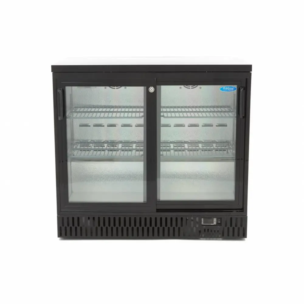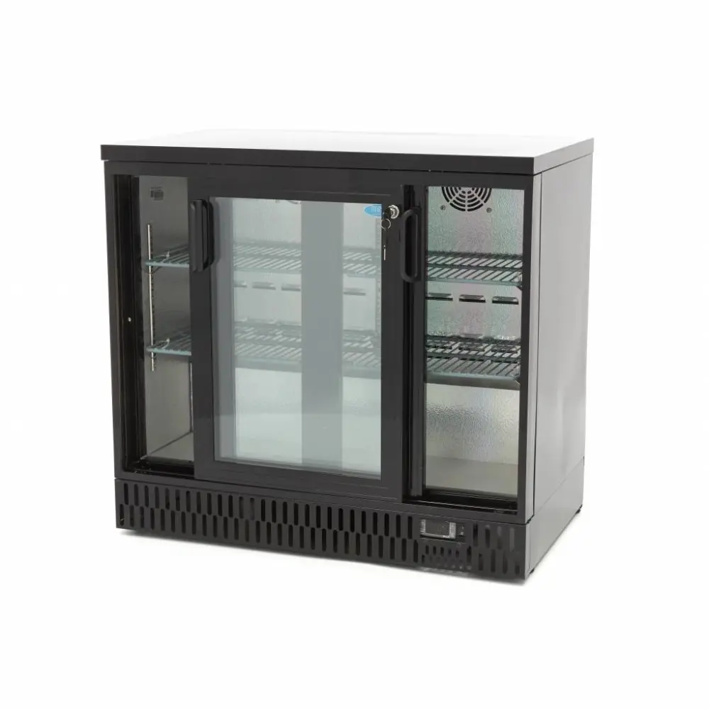 Chcete-li profesionálně prezentovat nápoje a občerstvení a zároveň je udržet chlazené, potřebujete tuto luxusně zpracovanou černou chladničku na nápoje. Má ideální velikost pro umístění na bar nebo pult. Tento model má objem 214 l a je vybaven dvěma posuvnými dveřmi s dvojitým sklem. Obě dveře jsou opatřeny zámkem pro úplné uzavření chladničky. Pro ještě lepší prezentaci produktů v chladničce na nápoje má zabudované LED osvětlení.