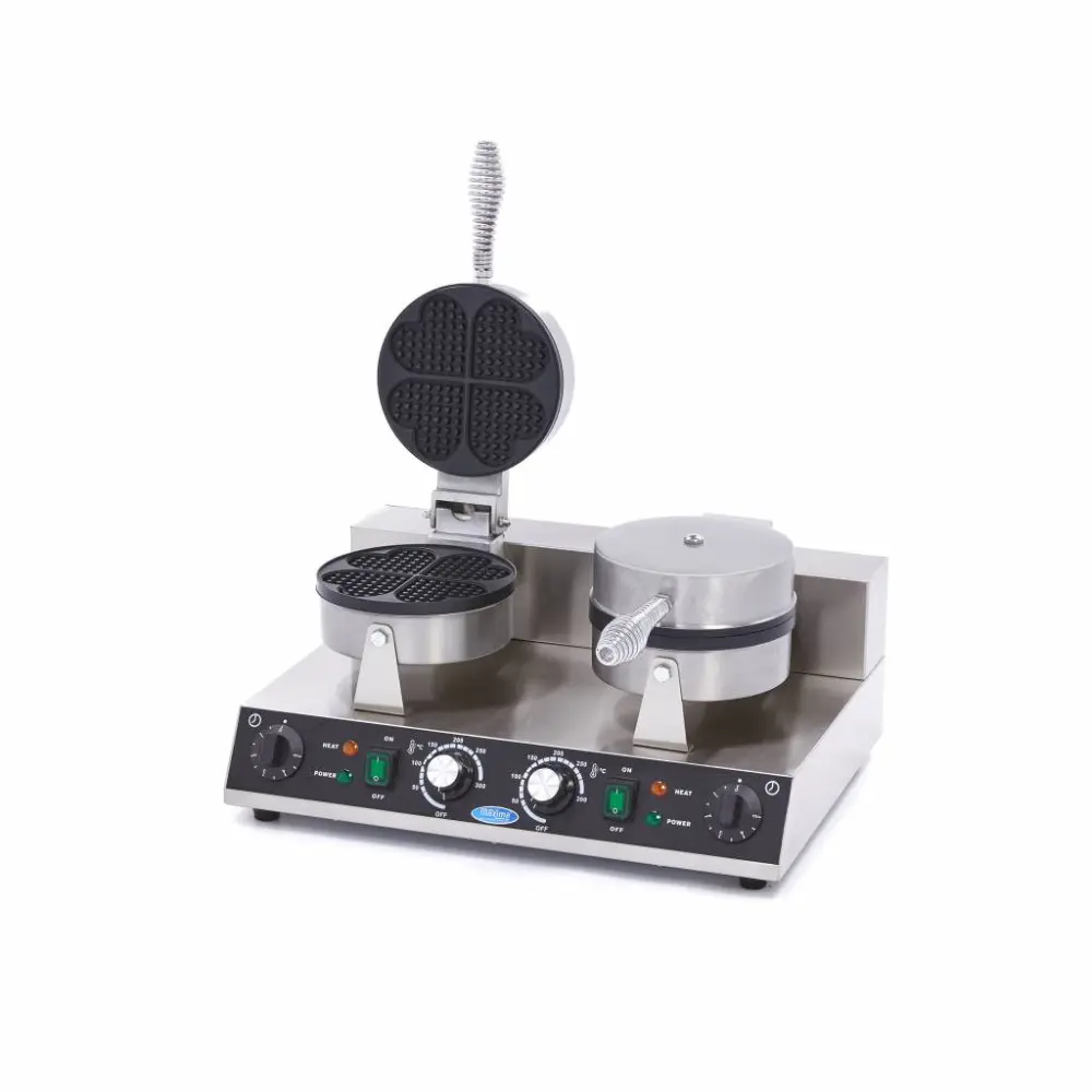 S tímto profesionálním dvojitým vaflovačem můžete připravit osm vaflových srdcí najednou. Má kryt z nerezové oceli a nepřilnavou hliníkovou pečicí desku. Analogový ovládací panel má robustní knoflíky pro nastavení teploty a časovače. Je ideální na veletrh, trh, do restaurace nebo kavárny.