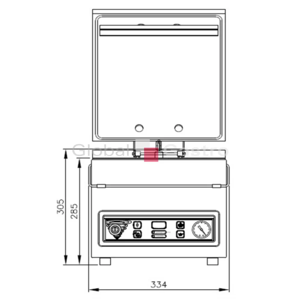 Průhledné "vypouklé" krycí víko je vyrobeno ze speciálního odolného akrylového skla a rám vnějšího víka je z ušlechtilé oceli. Opatřeno automatickým otevíráním. Pohon je zajišťován napájením o 230 V s příkonem 0,4 kW. Robustní vakuová balička je vyrobena z nerezové oceli. Ovládání senzorem vakua, snadné a přesné nastavení požadovaného vakua na digitálním ovládacím panelu s časovým řízením svařování.