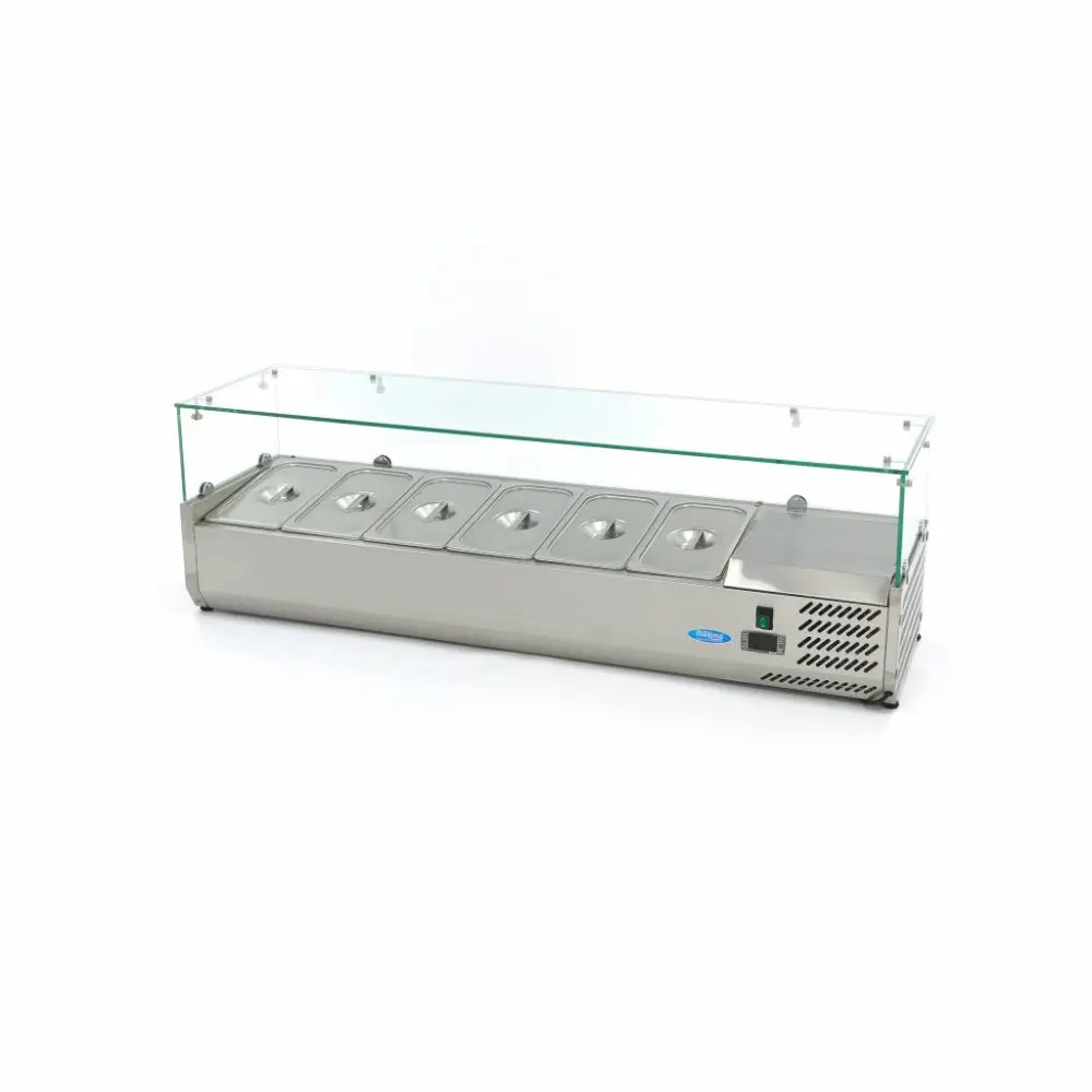 Tato pultová chladnička s povrchovou montáží má skleněný kryt a je široká 140 cm. Nabízí prostor pro šest nádob Gastronorm o velikosti 1/3 GN, do kterých můžete umístit suroviny, které potřebujete mít po ruce, a které můžete uchovávat v chladu. Její součástí je také digitální regulátor teploty, který se snadno nastavuje a je snadno čitelný.