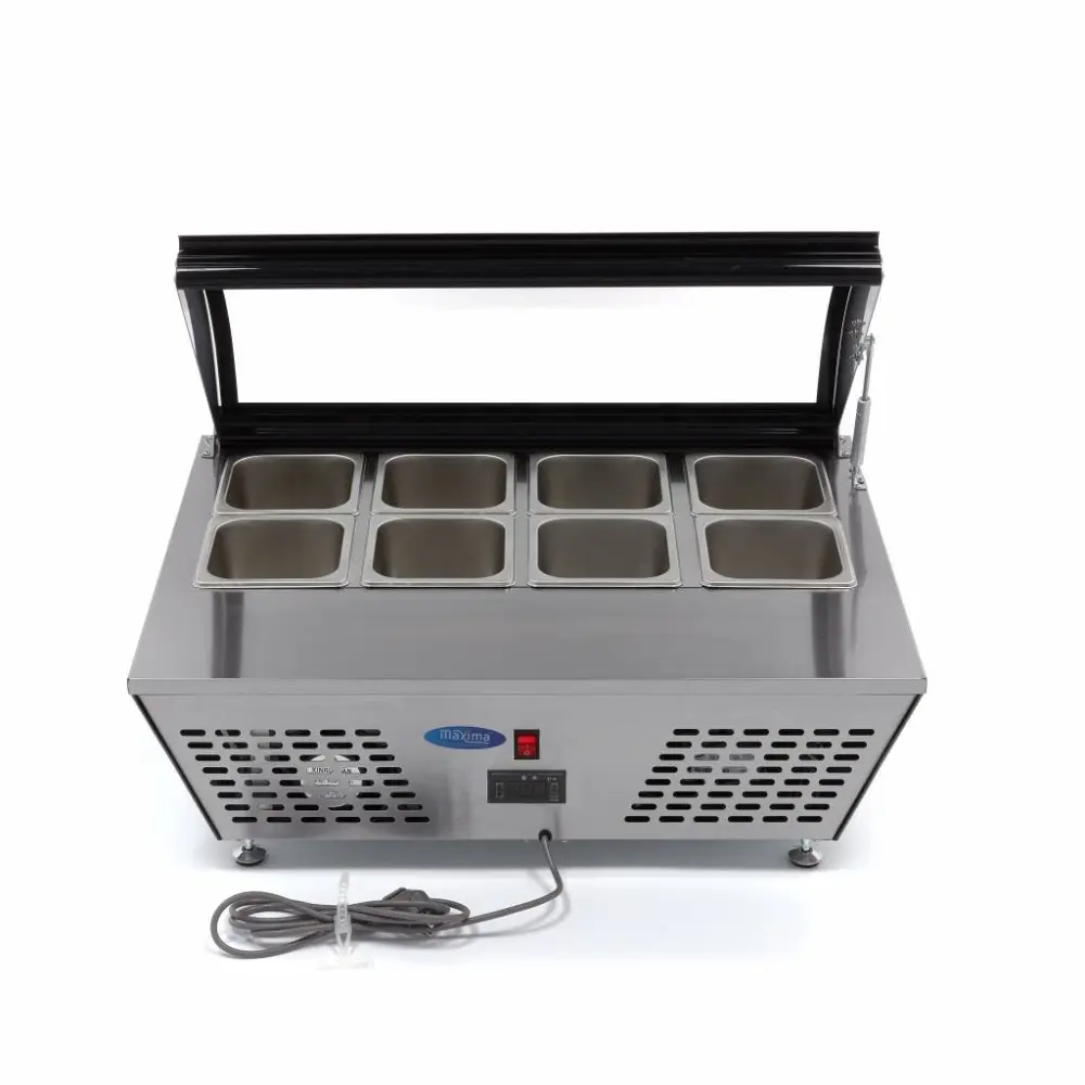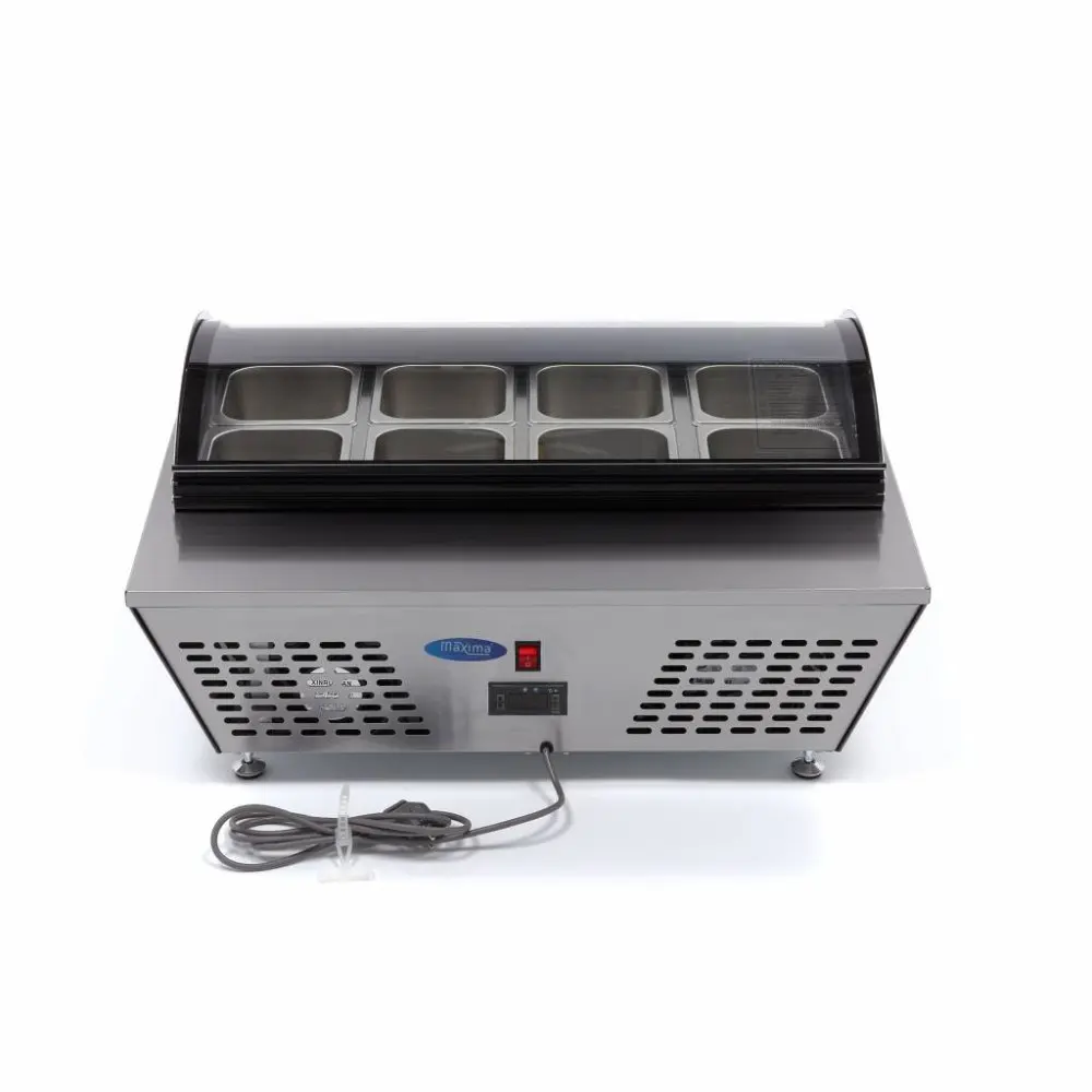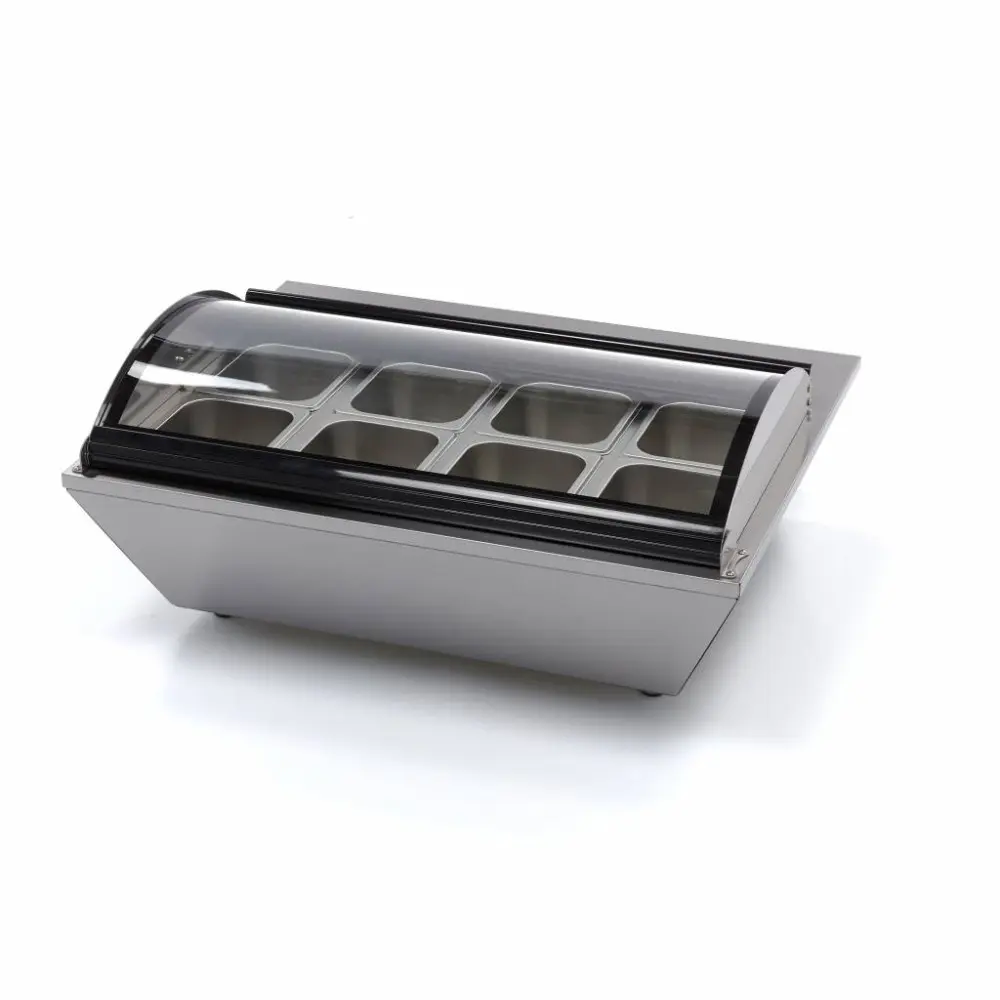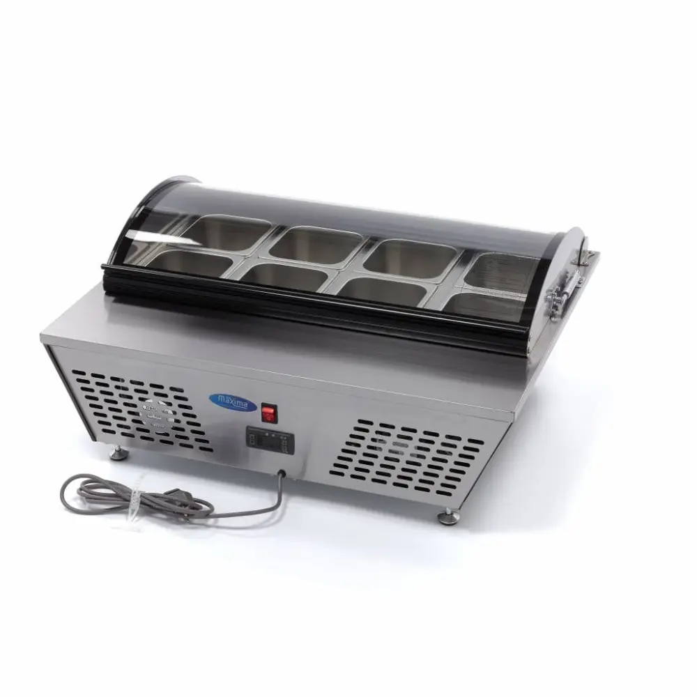 Tato mini saladeta je chladicí vitrína s krytem. Pod pevným skleněným víkem s panty je prostor pro 8 podnosů o velikosti 1/6 GN nebo 4 podnosy o velikosti 1/3 GN pro uchování různých ingrediencí v chladu. Díky tomu je mini stolní salátnice ideálním pracovištěm pro přípravu sendvičů nebo salátů. Pracovní plochu z nerezové oceli v přední části salátnice lze použít jako praktické prkénko na krájení. Má objem 67 litrů a standardně se dodává s 8 x 1/6 nádobami Gastronorm.