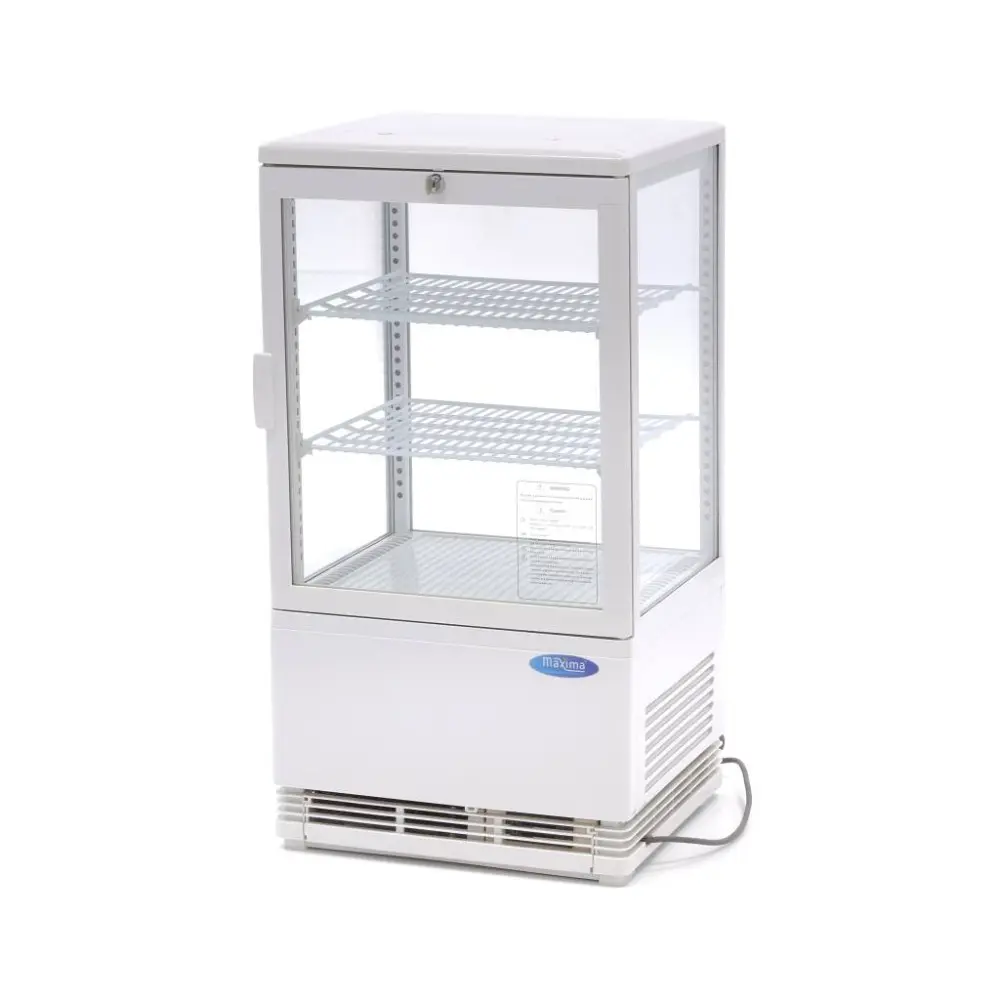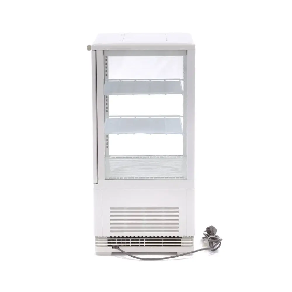 Chladnička s displejem má jedinečný chladicí cyklus, který omezuje tvorbu ledu. Tímto způsobem zůstává vždy dostatečně chladná. Chladivo použité v této vitríně je R600a, které neobsahuje freony. Chladnička s vitrínou se navíc každých šest hodin automaticky odmrazuje. Pomocí tlačítka na displeji v přední části přístroje můžete zapnout a vypnout LED osvětlení. Stejným tlačítkem se také ručně aktivuje funkce odmrazování. Čištění chladicí vitríny je snadné díky plastovému krytu a povlaku na policích. Tato chladnička s vitrínou je k dispozici v bílé barvě.