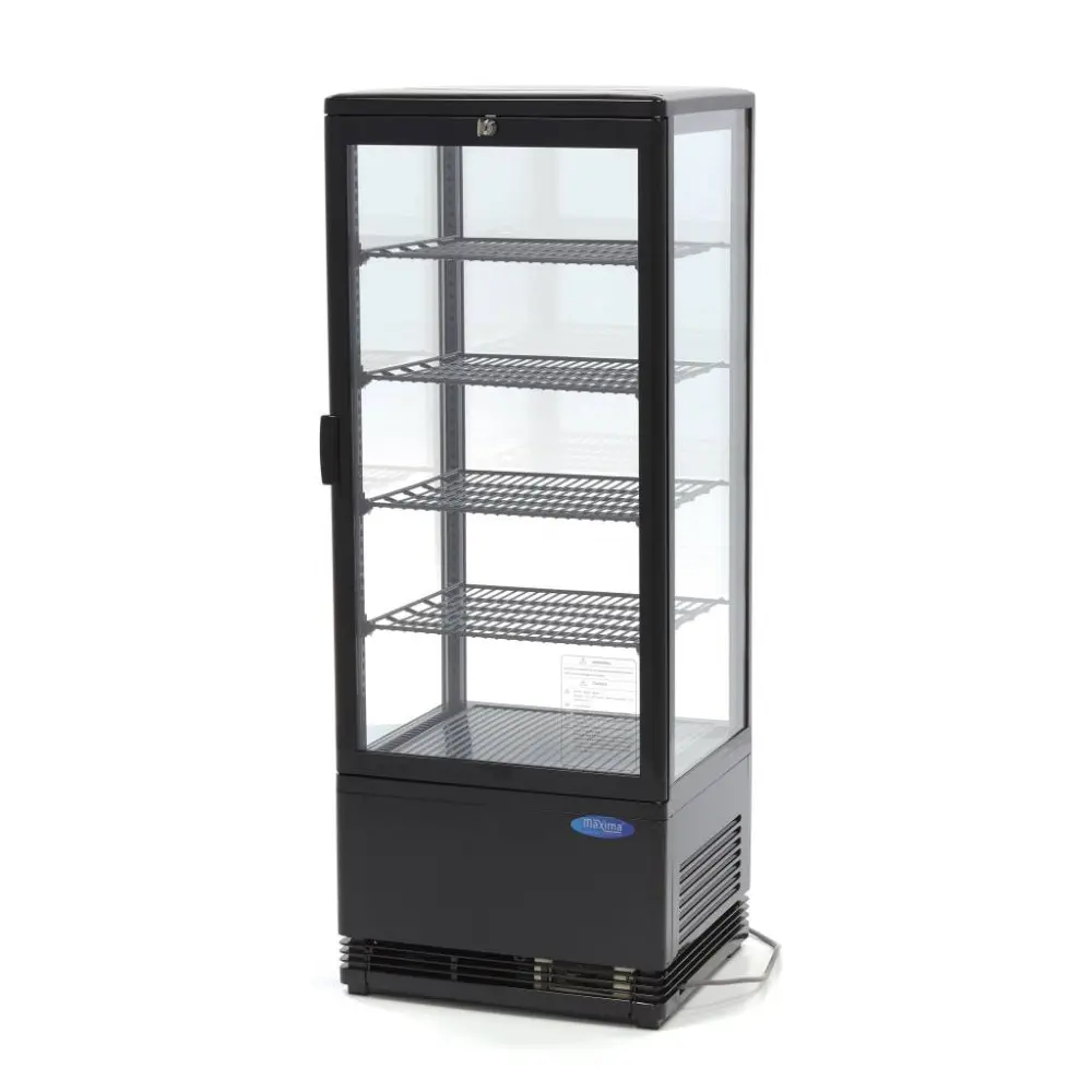 Tato profesionální chladnička s vitrínou má velký objem 98 litrů. Jedná se o robustní spotřebič určený pro každodenní používání. Je vybavena čtyřmi nastavitelnými policemi. Pokud však často skladujete menší položky, lze ji snadno rozšířit o další police. Díky chladicímu systému s ventilátorem jsou výrobky udržovány stejně chladné bez ohledu na to, kde jsou v chladničce umístěny. Vitrína má robustní konstrukci a čtyři nožičky zajišťují, že zůstane pevně na svém místě. Díky čtyřem skleněným okénkům a vnitřnímu energeticky úspornému LED osvětlení jsou výrobky prezentovány atraktivně a profesionálně. Volně stojící vitrína je navíc vybavena zámkem, který se dodává se dvěma klíči.
