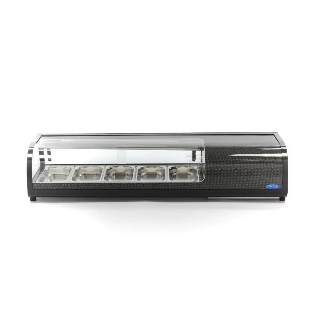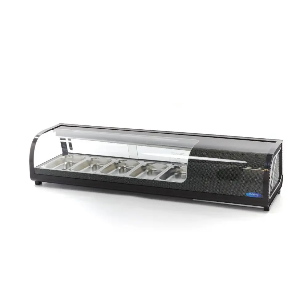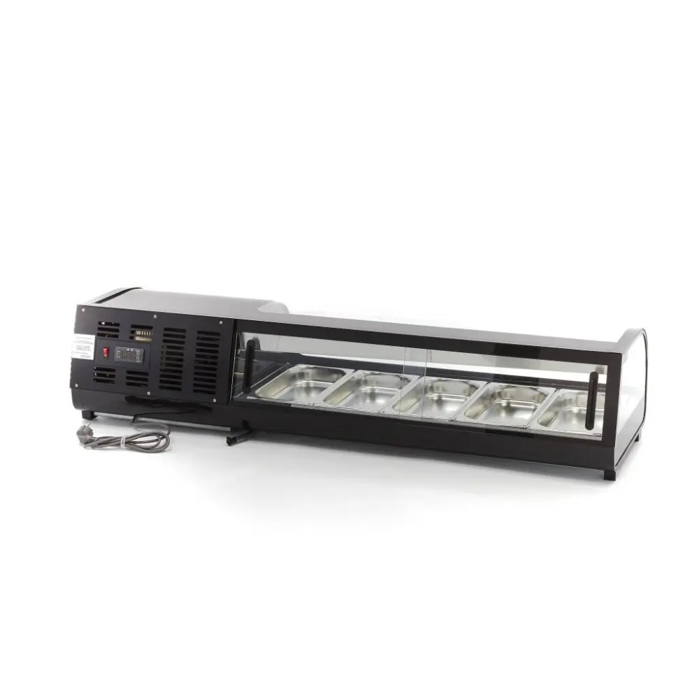 Tato stolní vitrína na tapas je vhodná jak k prezentaci potravin, tak k uchování vybraných položek v chladu. Zakřivené skleněné okno a elegantní černý kryt dodávají této vitríně luxusní vzhled. Díky tomu je vhodná k umístění na pult, aby hosté snadno viděli, co je v nabídce. Stolní vitrína je vhodná k prezentaci tapas, ale také k uchování sushi pokrmů a rybích výrobků v chladu. Tuto profesionální vitrínu na tapas lze použít v kombinaci s nádobami GN a dodává se s 5 x 1/3 nádobami GN připravenými k použití.