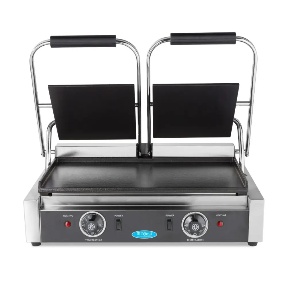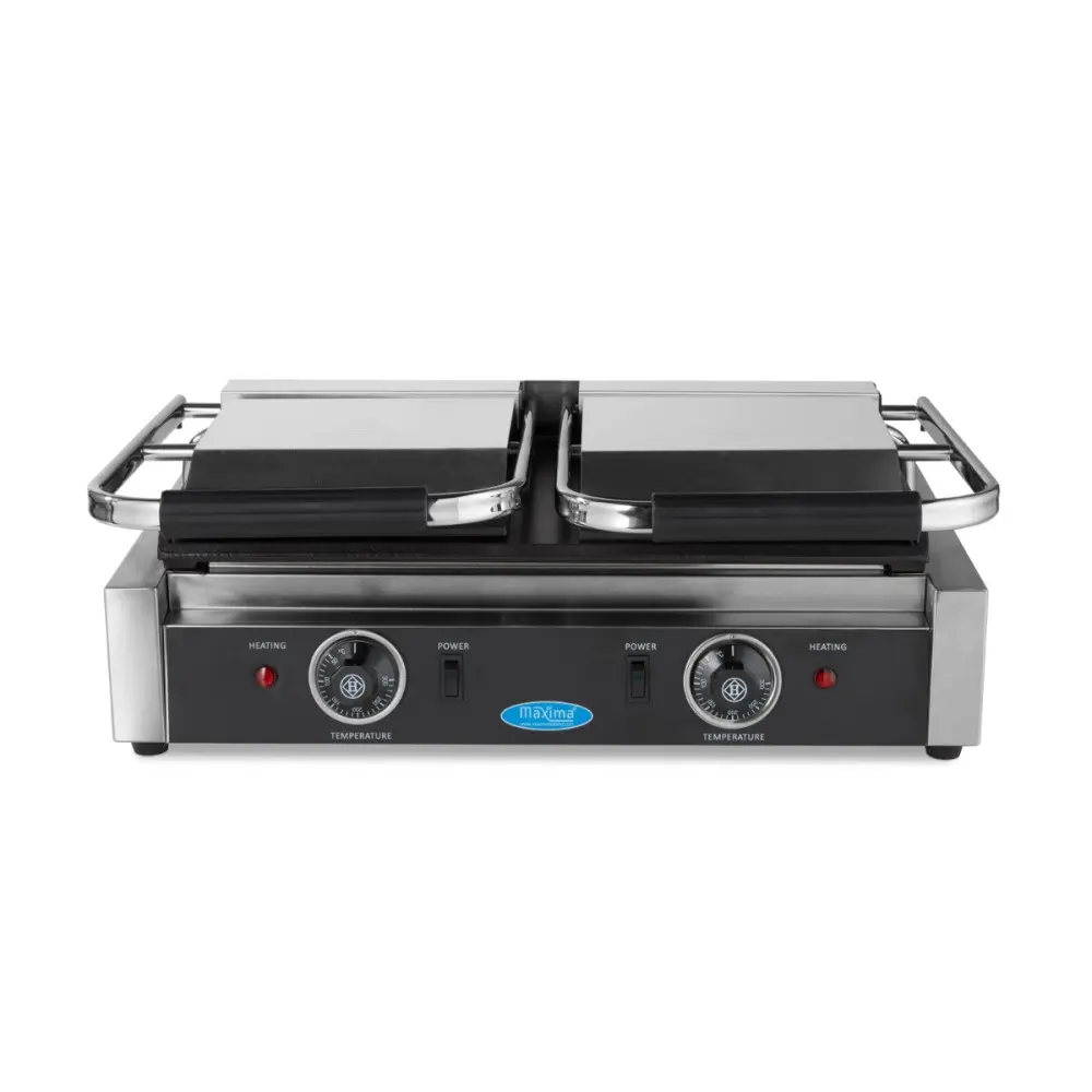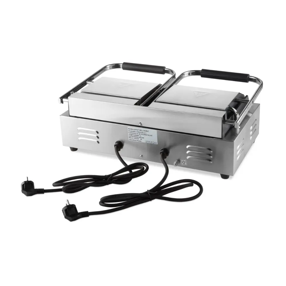 Na hladkých a těžkých litinových pečicích deskách můžete grilovat a smažit ty nejchutnější sendviče, panini a další pokrmy. Protože kontaktní gril má dvojité grilovací desky, můžete snadno připravit jídlo pro velké skupiny lidí. Je ideální pro servírování ryb, zeleniny nebo masa. Tento profesionální kontaktní gril je nepostradatelný v každé gastronomické kuchyni a díky své robustní konstrukci vám přístroj dlouho vydrží.