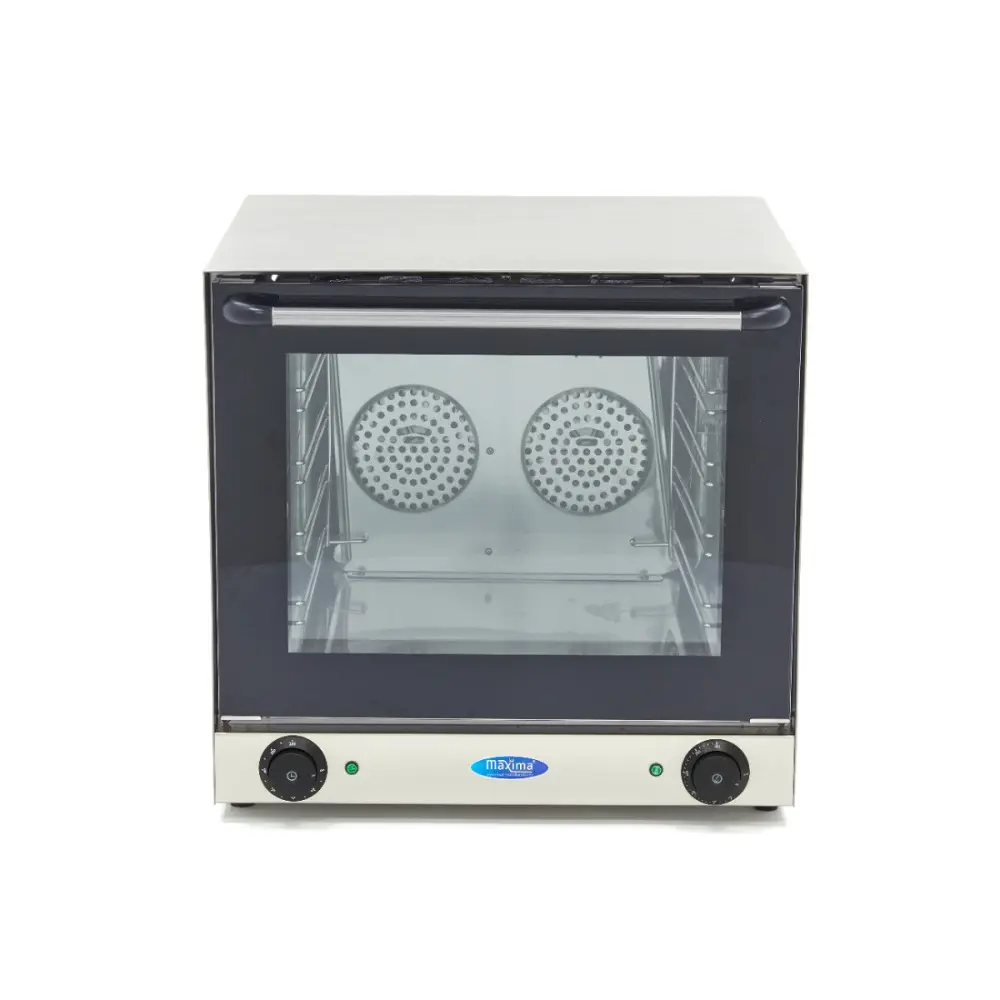 Rovnoměrně rozložené teplo v této konvekční troubě zajišťuje stálou teplotu v celém spotřebiči. Světelné kontrolky ukazují, kdy trouba dosáhla správné teploty. S touto profesionální konvekční troubou je doba pečení kratší než s tradiční troubou. Dvířka jsou odnímatelná a opatřená dvojitým atermickým sklem. Obsluha je uživatelsky přívětivá díky analogovým tlačítkům a časovači, který lze nastavit v rozmezí 0 až 120 minut. Tato konvekční trouba je také standardně vybavena čtyřmi plechy o rozměrech 43,5 x 31,5 cm.