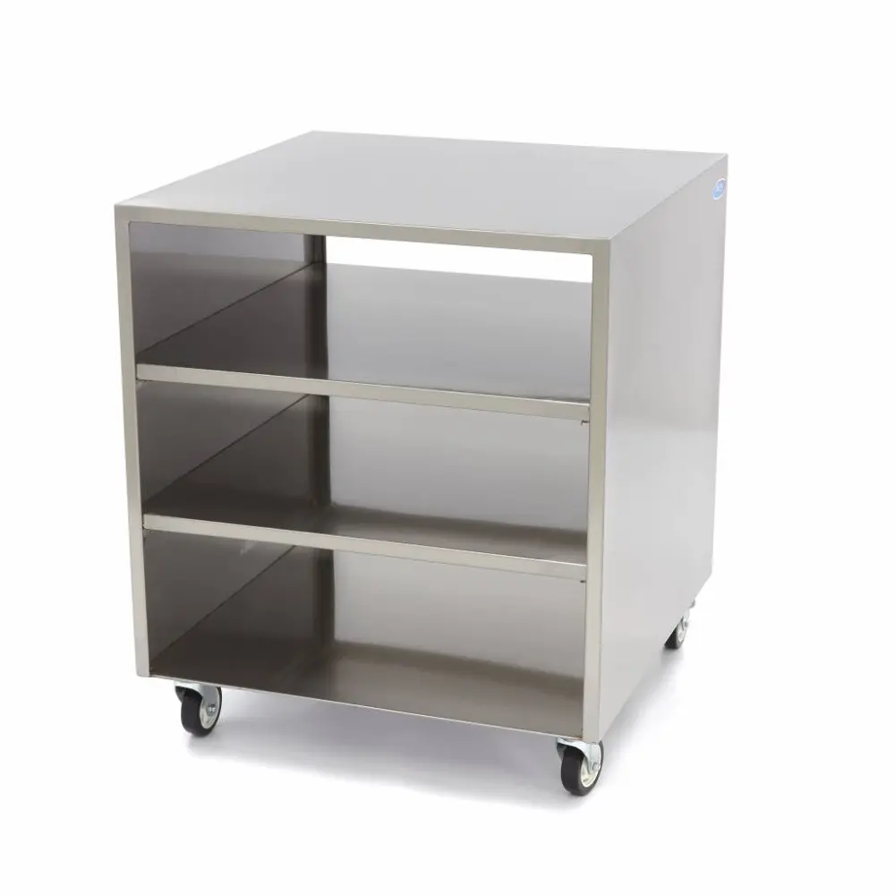 Strojní stolek je vyroben z nerezové oceli a velmi snadno se čistí. Základna je vybavena čtyřmi stabilními otočnými kolečky. Dvě z koleček mají brzdu, takže stůl zůstane stabilně na svém místě. Má nosnost 120 kg. Protože ne všechny kuchyňské spotřebiče mají vhodnou a stabilní základnu, je vždy užitečné objednat odpovídající stolek ke stroji. Zadní část tohoto stolu je otevřená.