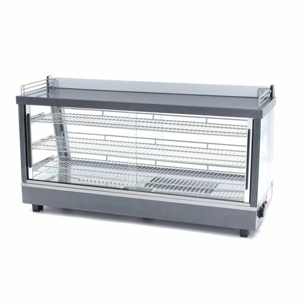 Připravujete hodně pokrmů, které je třeba udržovat delší dobu v teple? Pak použijte tento profesionální vyhřívaný stojan na potraviny o šířce 121,5 cm. Vyhřívaný stojan na potraviny má objem 186 litrů a je vybaven třemi výškově nastavitelnými chromovanými policemi. Skleněná skla pokrývají všechny strany vitríny a praktické LED osvětlení na vnitřní straně se postará o atraktivní prezentaci pokrmů. Vyhřívaná vitrína na potraviny je také vybavena držákem na karty pro reklamu vašich výrobků. Přední i zadní část vitríny má posuvná dvířka. Zákazníci si tak mohou pečivo, grilované pokrmy nebo občerstvení z vitríny sami vyndat. Obsluha tak může vitrínu snadno doplňovat.