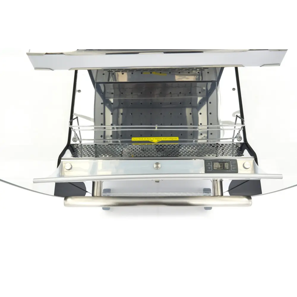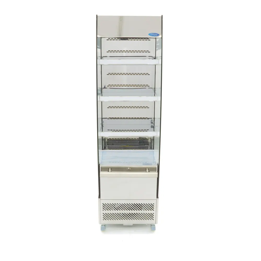 Otevřená chladnička je ideální pro použití v jakémkoli stravovacím zařízení, zejména v těch, která nabízejí možnost samoobsluhy. Produkty jsou prezentovány atraktivním a profesionálním způsobem na třech různých policích. Díky vestavěnému LED osvětlení jsou potraviny a nápoje doslova v centru pozornosti, takže si zákazníci mohou sami vybrat. Police jsou také vybaveny držáky na karty pro umístění cenovek. Tato otevřená chladnička má navíc dvě kolečka s brzdami, takže ji lze snadno přemisťovat. Je vybavena madlem a nárazníkem. Skleněné tabule po stranách vitríny mají dvojité sklo a zakřivené skleněné tabule jsou připevněny k pouzdru z chromované oceli.