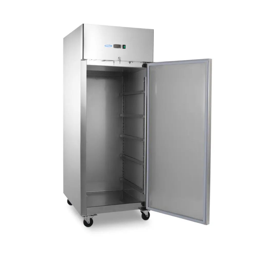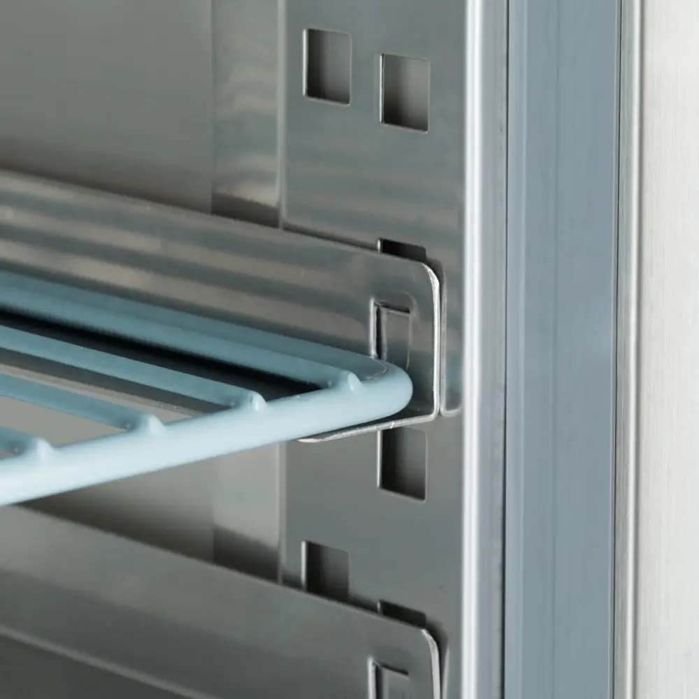 Tato výkonná chladnička má objem 800 l a je vhodná pro dvě přihrádky o rozměrech 60 x 40 cm na každé úrovni. Dodává se s 5 sadami vodítek pro umístění dvou zásobníků o rozměrech 60 x 40 cm nebo jednoho zásobníku o rozměrech 60 x 80 cm. Uvnitř má LED osvětlení a díky čtyřem kolečkům se snadno přemisťuje. Ideální pro pekárny nebo kavárny.