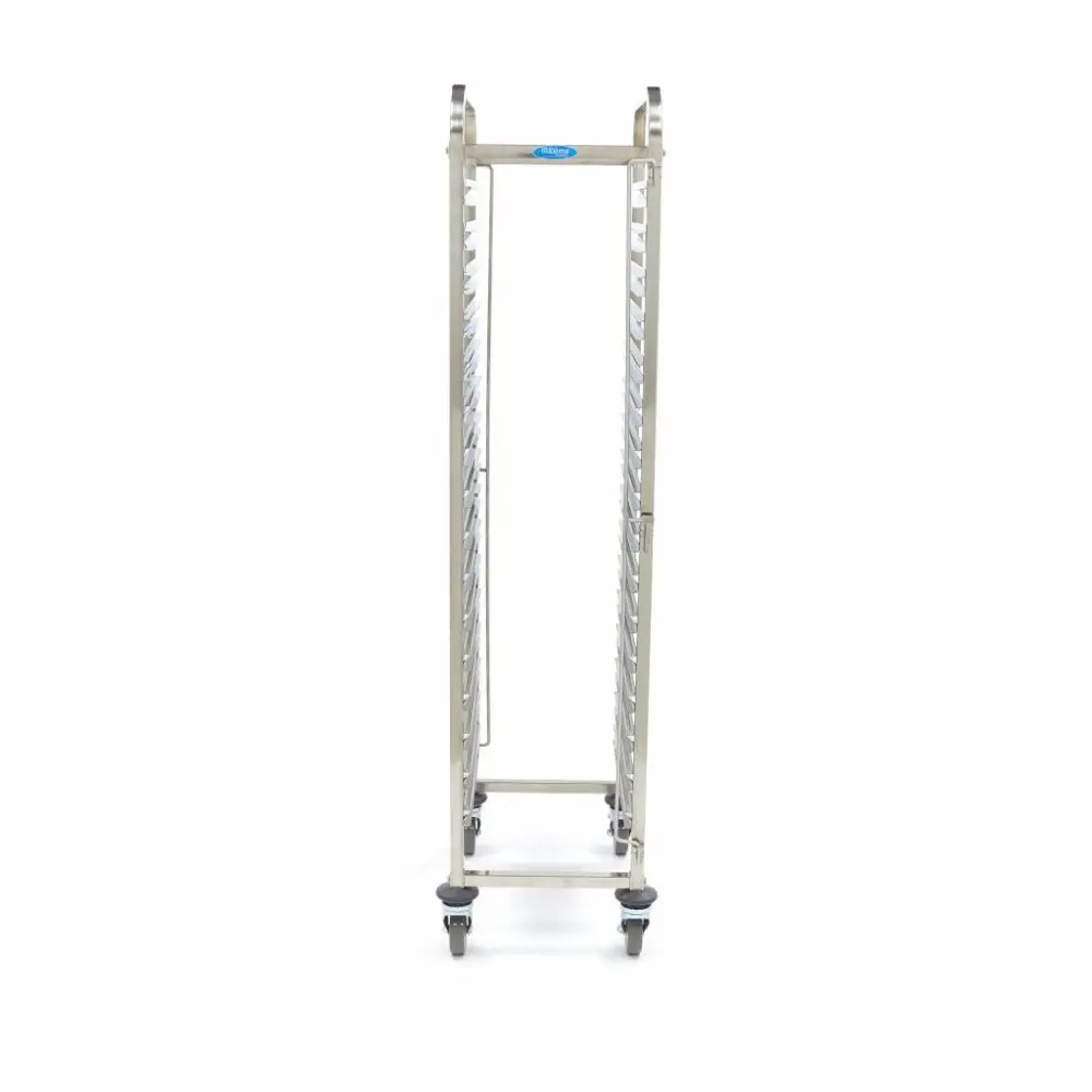 Tento vozík na podnosy je vyroben z nerezové oceli a má prostor až pro 16 podnosů. Je ideální pro použití v pekárnách, restauracích, hotelech a samoobsluhách. Tento výrobek se dodává v plochém balení a jeho montáž je velmi rychlá a snadná. Obsahuje čtyři kolečka, z nichž dvě mají brzdy, a je vhodný pro podnosy GN 1/1.