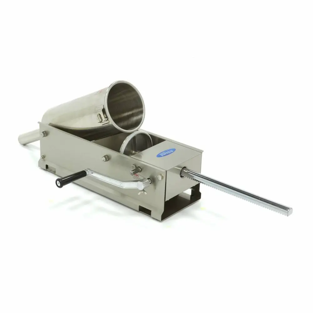 Tento horizontální plnič klobás má objem 5 litrů, který umožňuje přípravu lahodných klobás. Tento výrobník klobás má dvě rychlosti a dodává se se čtyřmi plnicími trubkami. Má nerezový kryt, základní desku, hřídel a lisovací desku pro snadné čištění. Ideální pro řeznictví nebo restaurace.