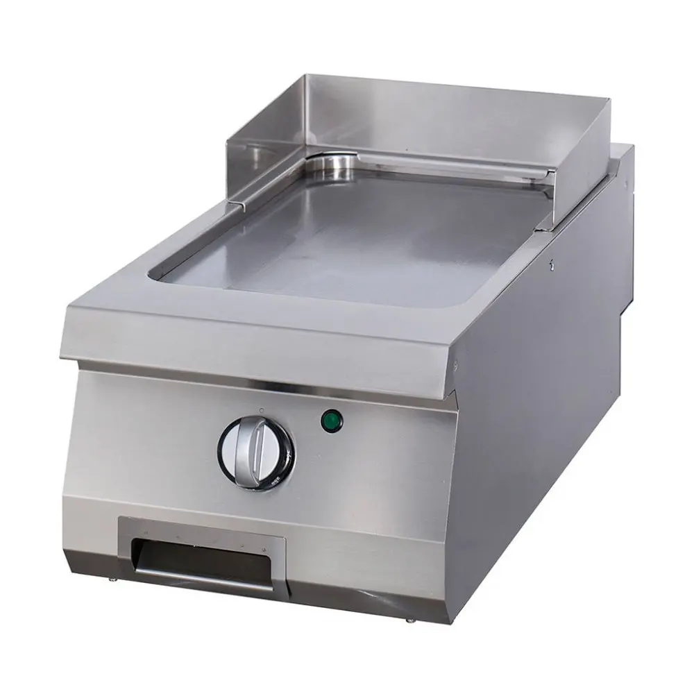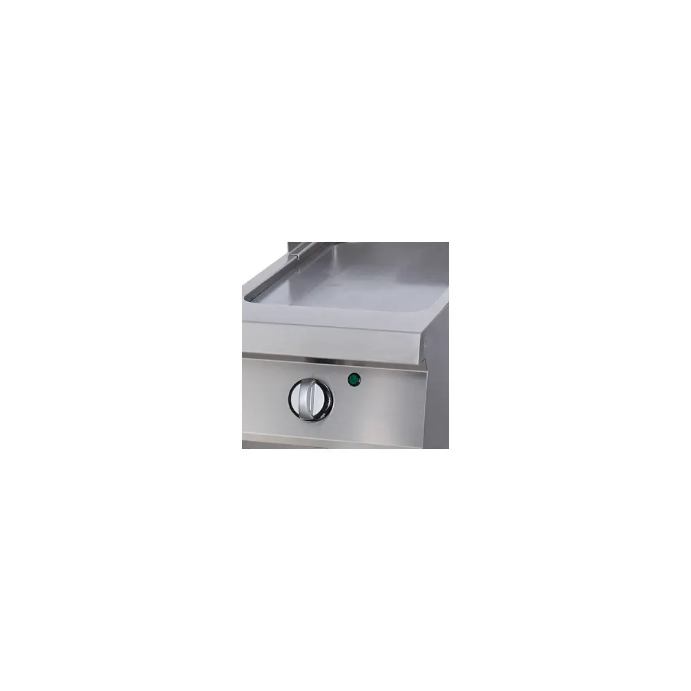 S touto robustní grilovací deskou grilujete pokrmy na hladké 15mm desce z tvrzené nerezové oceli se saténovým povrchem. Grilovací deska je pěkně zasazena do vodotěsné prohlubně. Praktická odkapávací miska o objemu 1,5 litru a ochrana proti rozstřiku zabraňují rozlití oleje a zajišťují bezpečnost práce s touto pánví. Pomocí bezpečnostního termostatu lze nastavit teplotu v rozmezí 50 až 300 ºC. Pokud v kuchyni pracujete s varnou linkou, tento gril se k ní skvěle hodí.