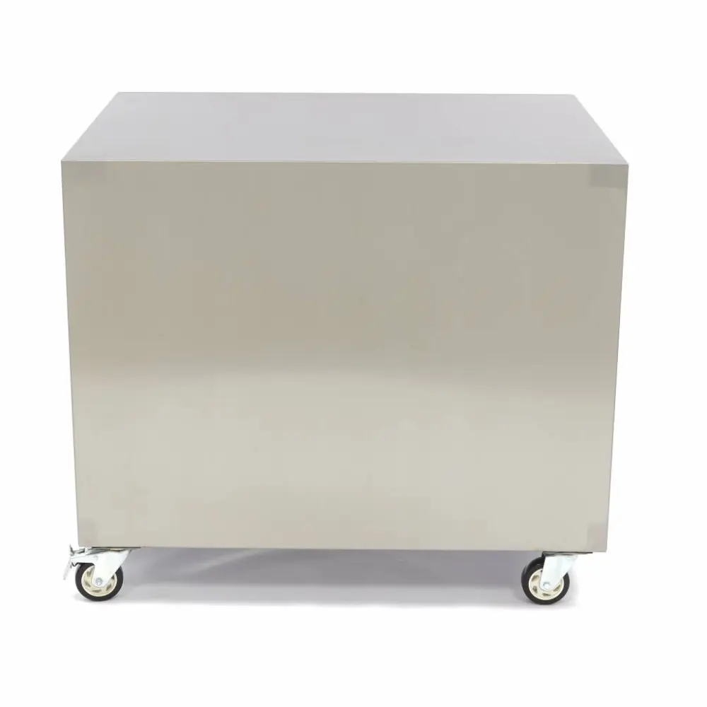 Strojní stolek je vyroben z nerezové oceli a velmi snadno se čistí. Základna je vybavena čtyřmi stabilními otočnými kolečky. Dvě z koleček mají brzdu, takže stojan zůstává stabilní a pevný. Stůl má nosnost 120 kg a váží 35 kg. Protože ne všechny kuchyňské spotřebiče mají vhodnou a stabilní základnu, je vždy užitečné objednat odpovídající stolek pro spotřebiče. Zadní část tohoto stolku je otevřená.