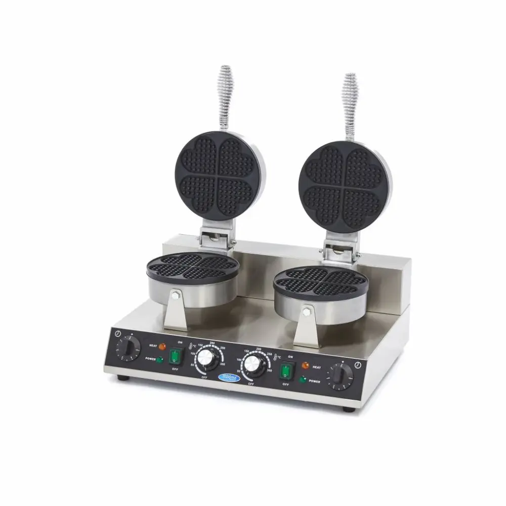 S tímto profesionálním dvojitým vaflovačem můžete připravit osm vaflových srdcí najednou. Má kryt z nerezové oceli a nepřilnavou hliníkovou pečicí desku. Analogový ovládací panel má robustní knoflíky pro nastavení teploty a časovače. Je ideální na veletrh, trh, do restaurace nebo kavárny.